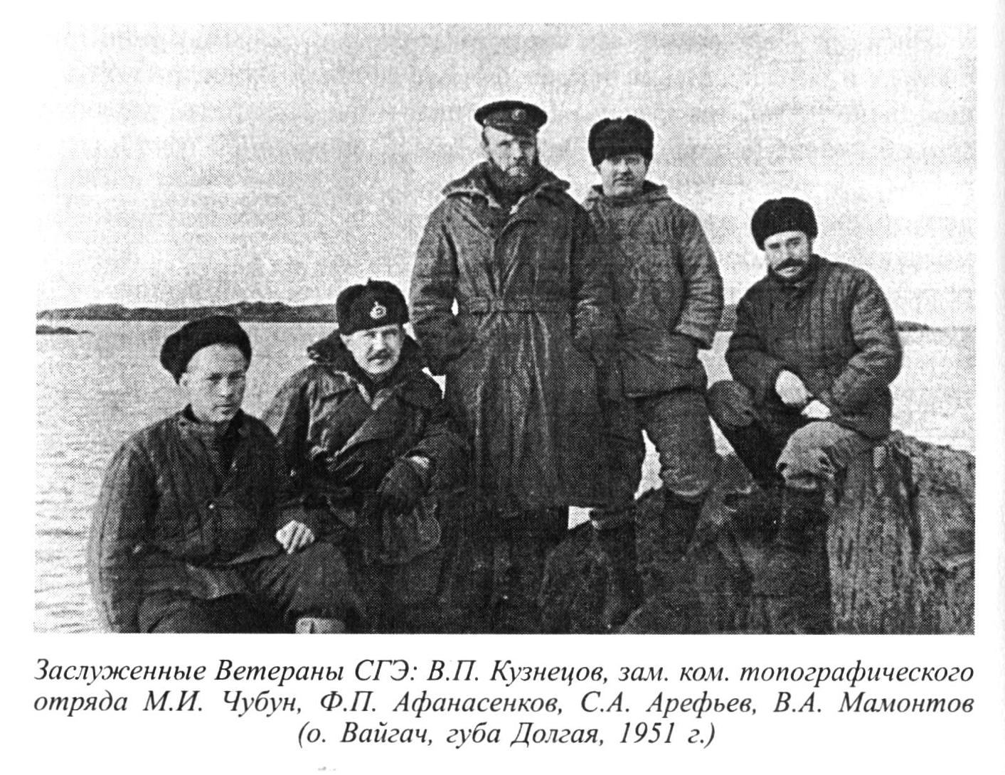 Заслуженные Ветераны СГЭ: В.П. Кузнецов, зам. ком. топографического отряда М.И. Чубун, Ф.П. Афанасенков, С.А. Арефьев, В.А. Мамонтов (о. Вайгач, губа Долгая, 1951 г.)