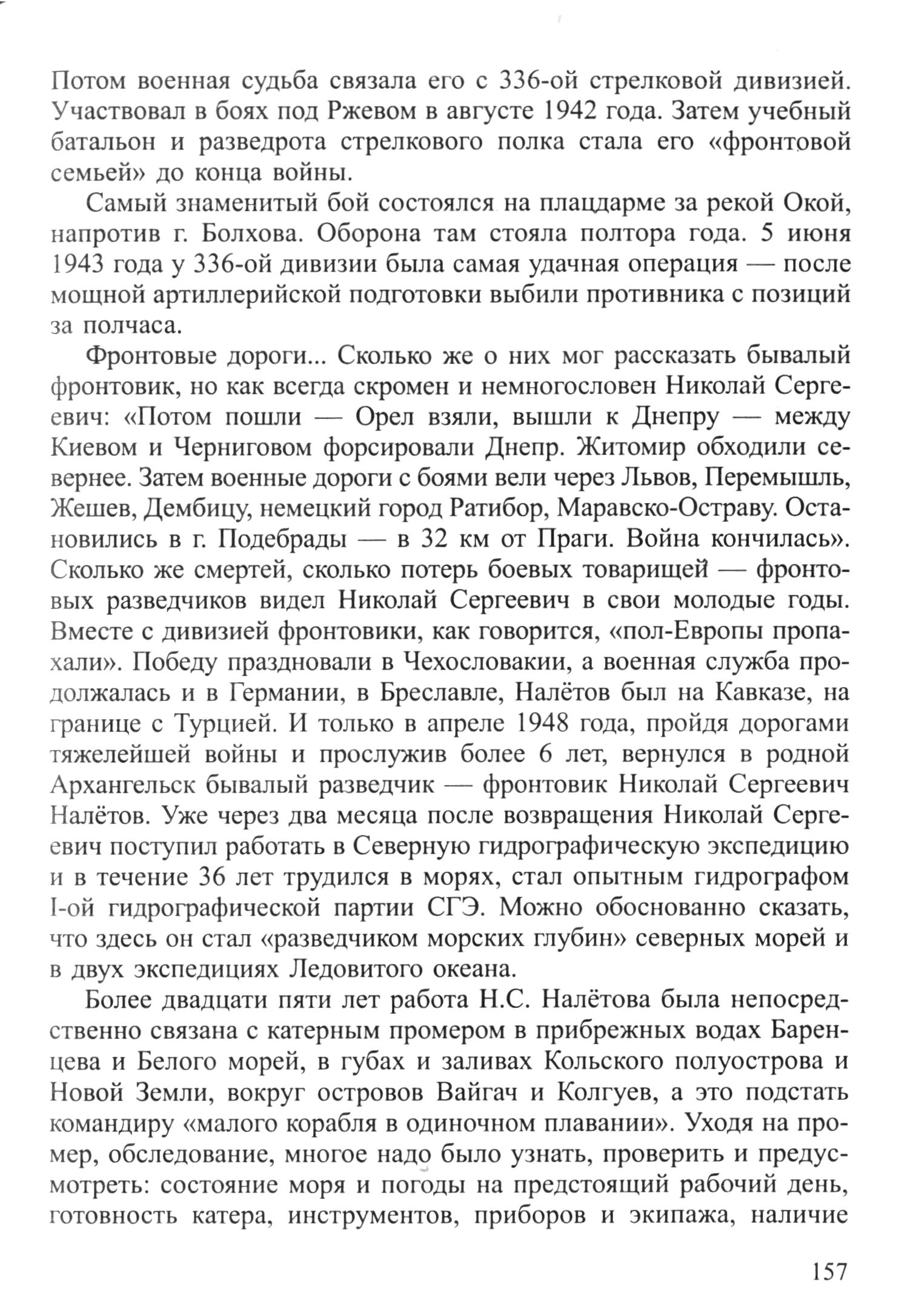 Сколько же смертей, сколько потерь боевых товарищей — фронтовых разведчиков видел Николай Сергеевич в свои молодые годы. Вместе с дивизией фронтовики, как говорится, «пол-Европы пропахали». Победу праздновали в Чехословакии, а военная служба продолжалась и в Германии, в Бреславле, Налётов был на Кавказе, на границе с Турцией. И только в апреле 1948 года, пройдя дорогами тяжелейшей войны и прослужив более 6 лет, вернулся в родной Архангельск бывалый разведчик — фронтовик Николай Сергеевич Налётов. Уже через два месяца после возвращения Николай Сергеевич поступил работать в Северную гидрографическую экспедицию и в течение 36 лет трудился в морях, стал опытным гидрографом 1-ой гидрографической партии СГЭ. Можно обоснованно сказать, что здесь он стал «разведчиком морских глубин» северных морей и в двух экспедициях Ледовитого океана.