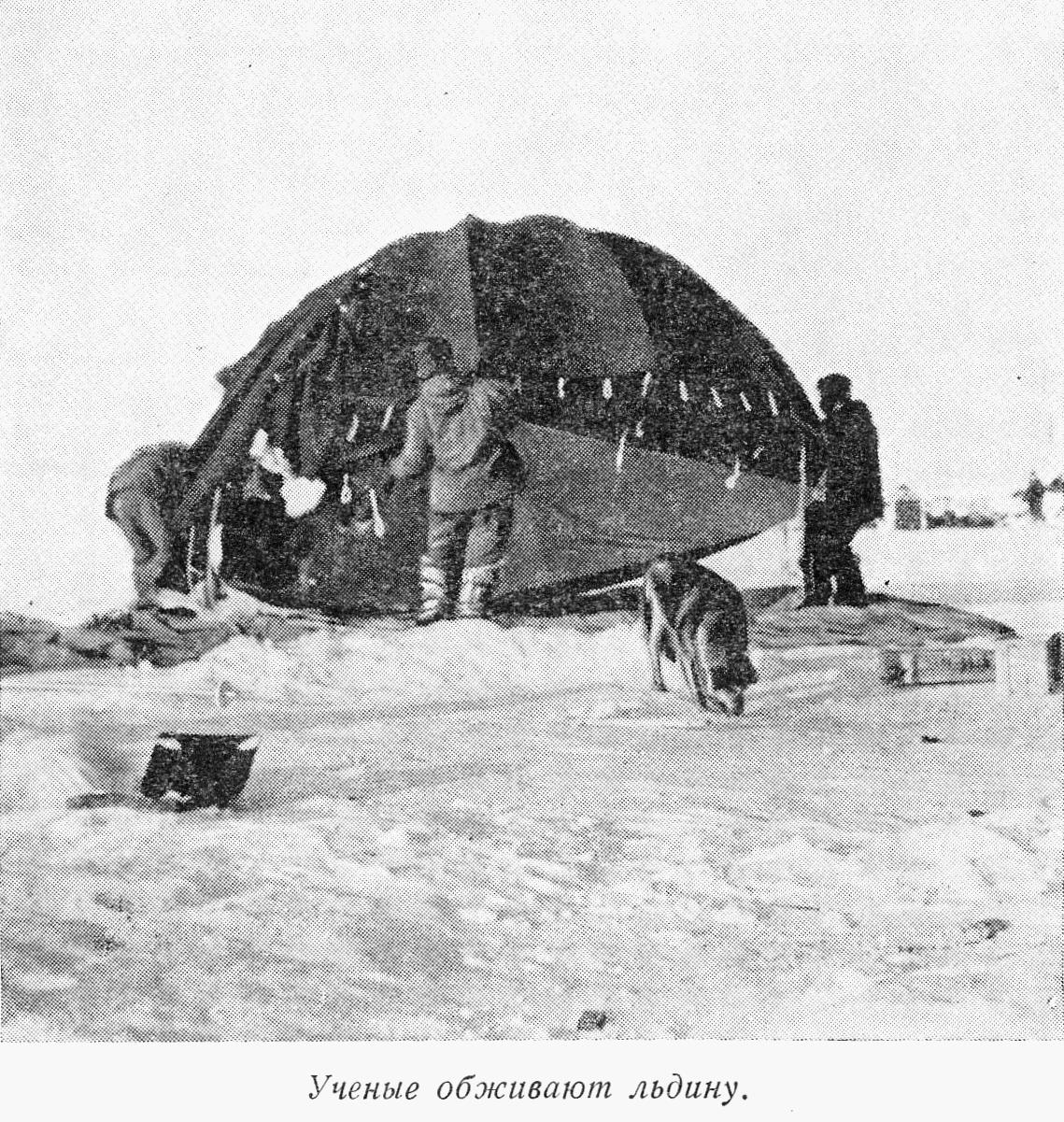 ... Еще несколько дней назад льдина была пустынной, а сейчас, 16 апреля, тут уже целый поселок. Прежде всего установили палатки для аэрологов, метеорологов, магнитолога, а также под радиостанцию и камбуз. Из снежных кирпичей построили астрономический павильон. В палатках поставлены изящные и очень удобные столики, оборудованы рабочие места для сотрудников. Ритмично тарахтит моторчик радиостанции. Ее «заведующий» Курко со своим молодым помощником Разбашем дают радиопривод самолетам полярной авиации, занятым перевозкой грузов с Большой Земли на дрейфующую льдину.