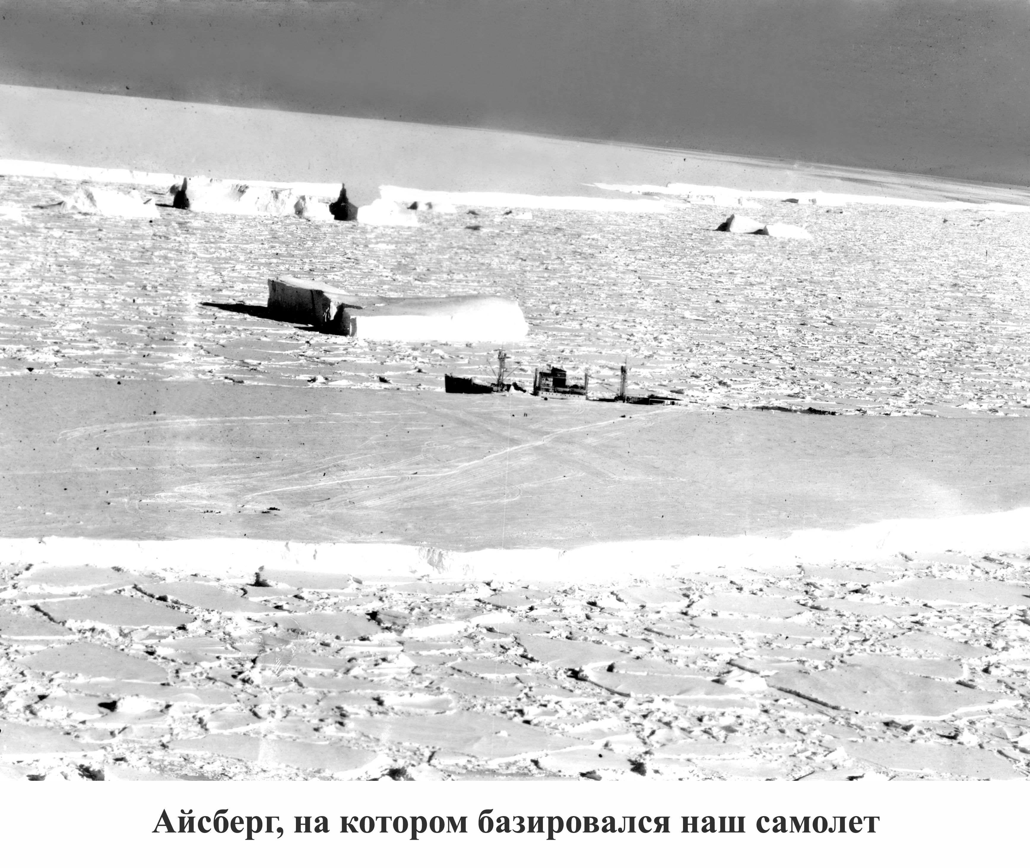 Но, пролетав в течение часа, сесть так и не смогли: остров закрыт туманом. Произвели посадку опять на айсберг, где самолет оставили на ночевку.