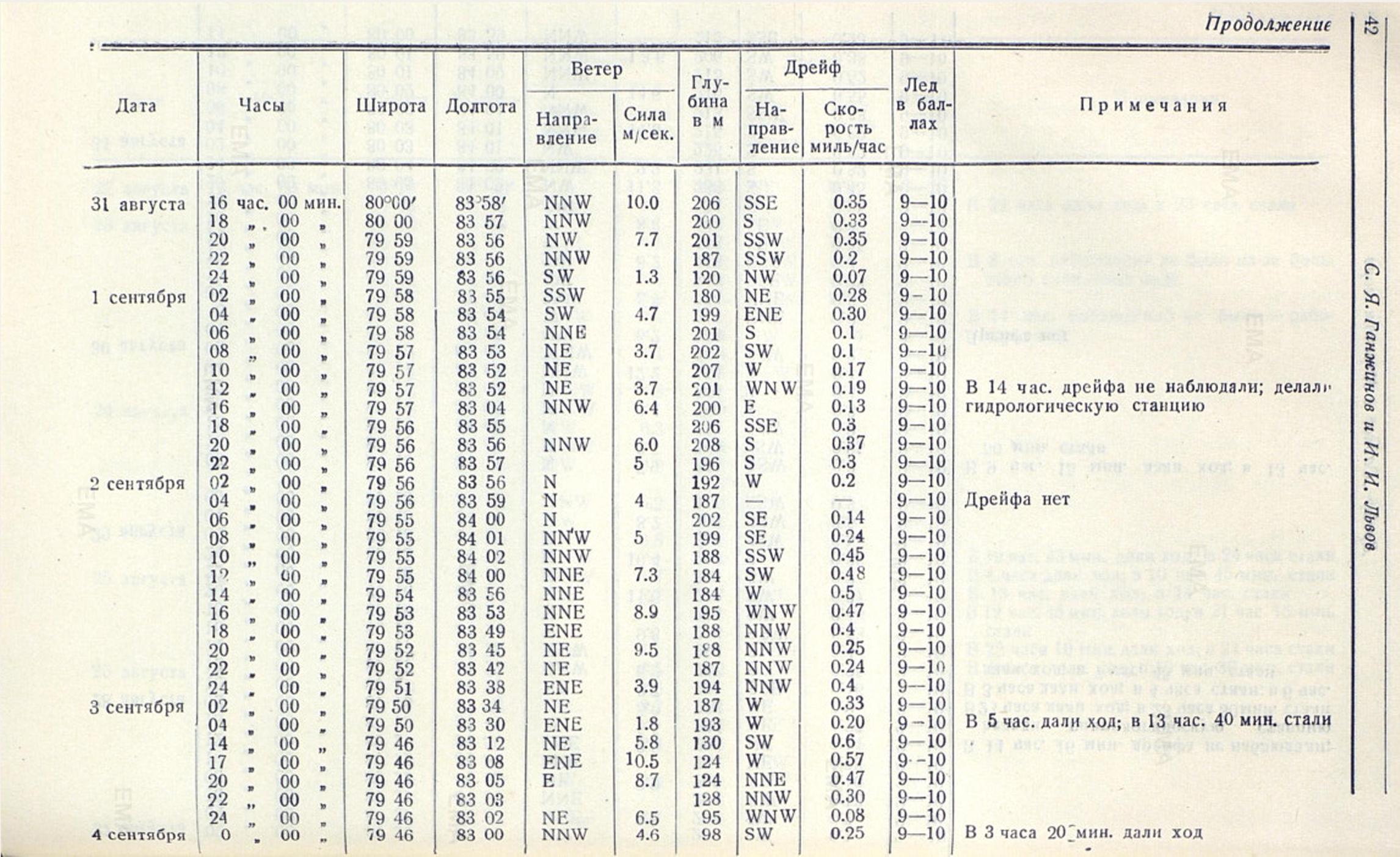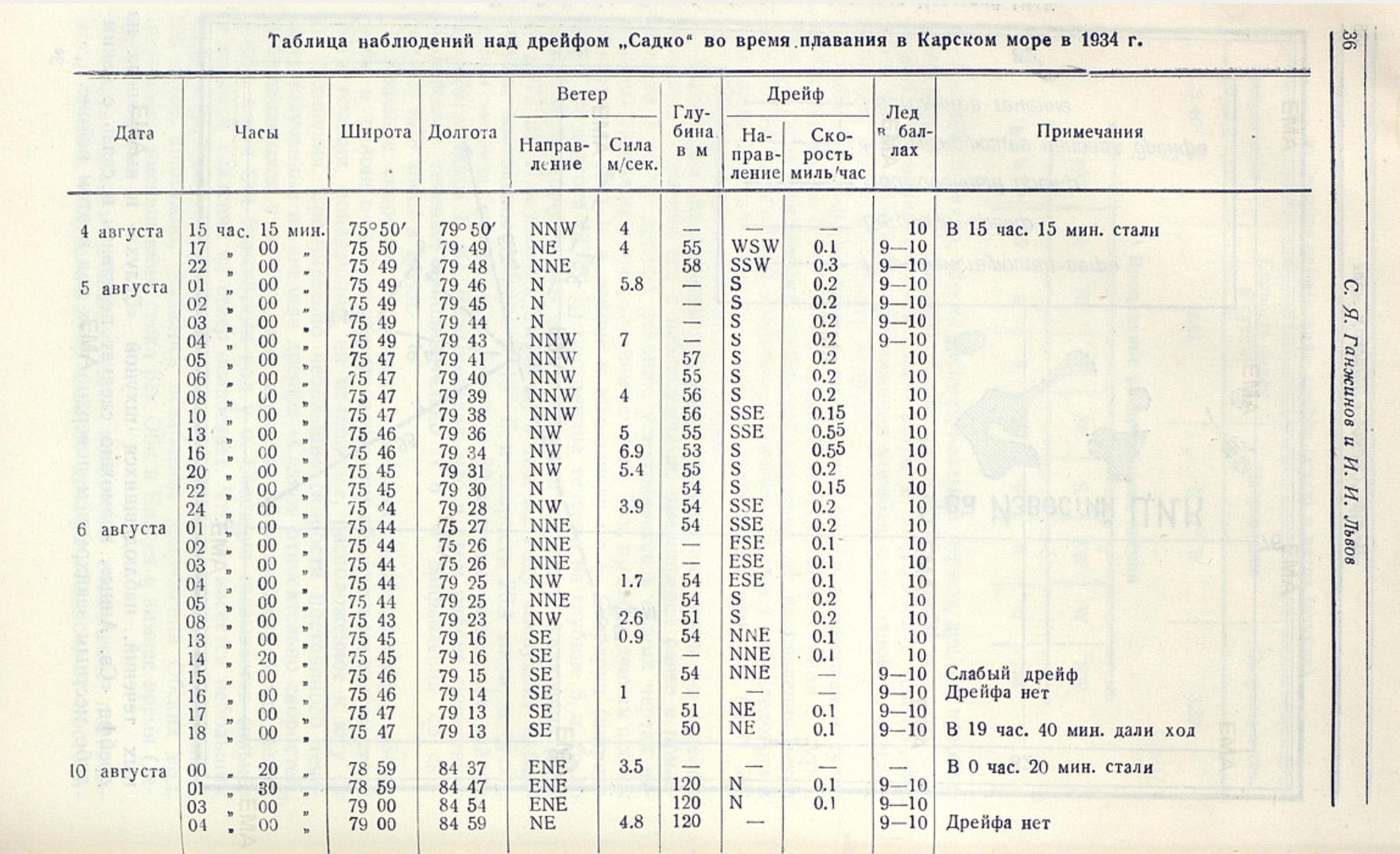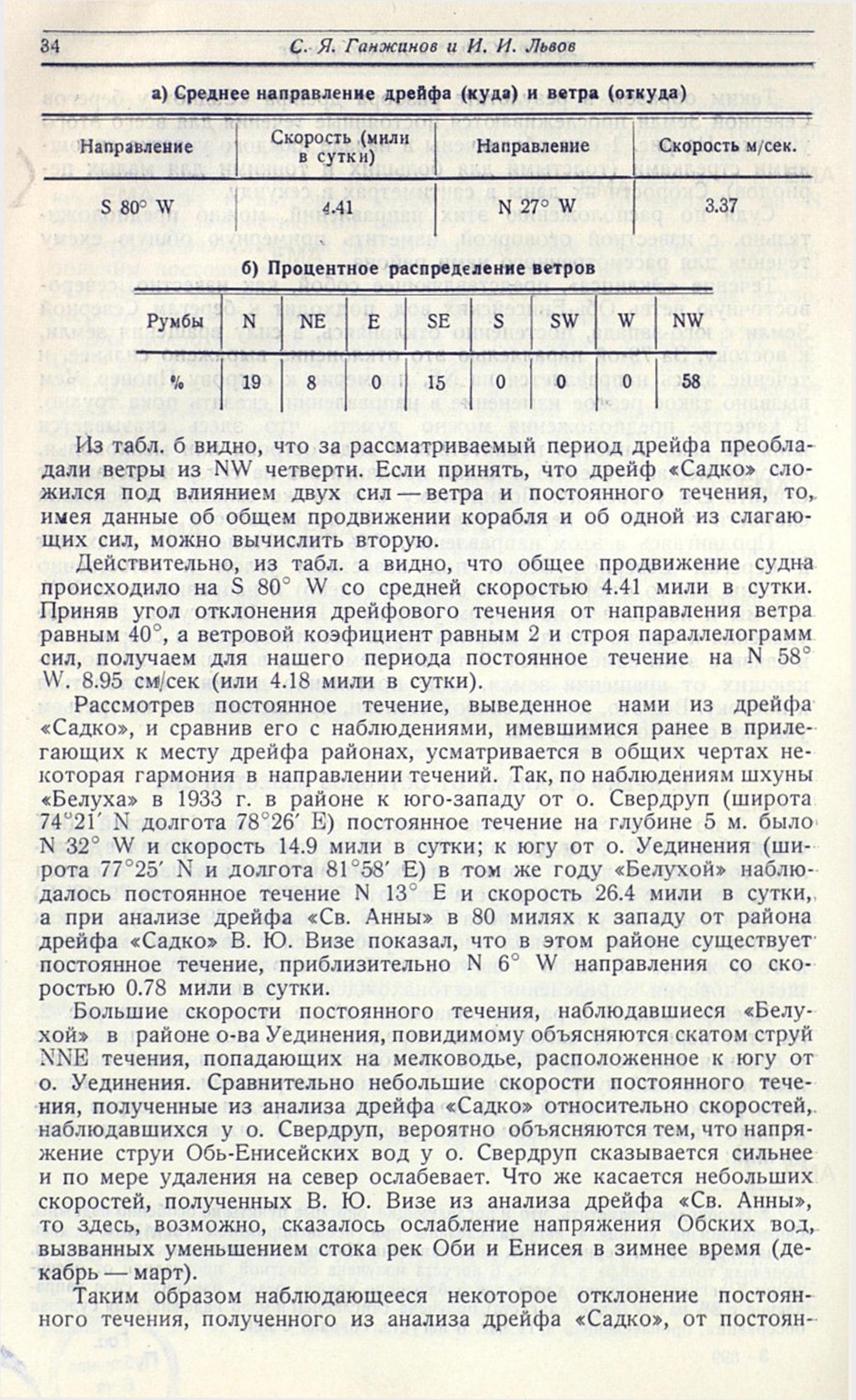 Рассмотрев постоянное течение, выведенное нами из дрейфа «Садко», и сравнив его с наблюдениями, имевшимися ранее в прилегающих к месту дрейфа районах, усматривается в общих чертах некоторая гармония в направлении течений. Так, по наблюдениям шхуны «Белуха» в 1933 г. в районе к юго-западу от о. Свердруп (широта 74°21' N долгота 78°26' Е) постоянное течение на глубине 5 м. было N 32° W и скорость 14. 9 мили в сутки; к югу от о. Уединения (широта 77°25' N и долгота 81°58' Е) в том же году «Белухой» наблюдалось постоянное течение N 13° Е и скорость 26. 4 мили в сутки, а при анализе дрейфа «Св. Анны» в 80 милях к западу от района дрейфа «Садко» В. Ю. Визе показал, что в этом районе существует постоянное течение, приблизительно N 6° W направления со скоростью 0. 78 мили в сутки.