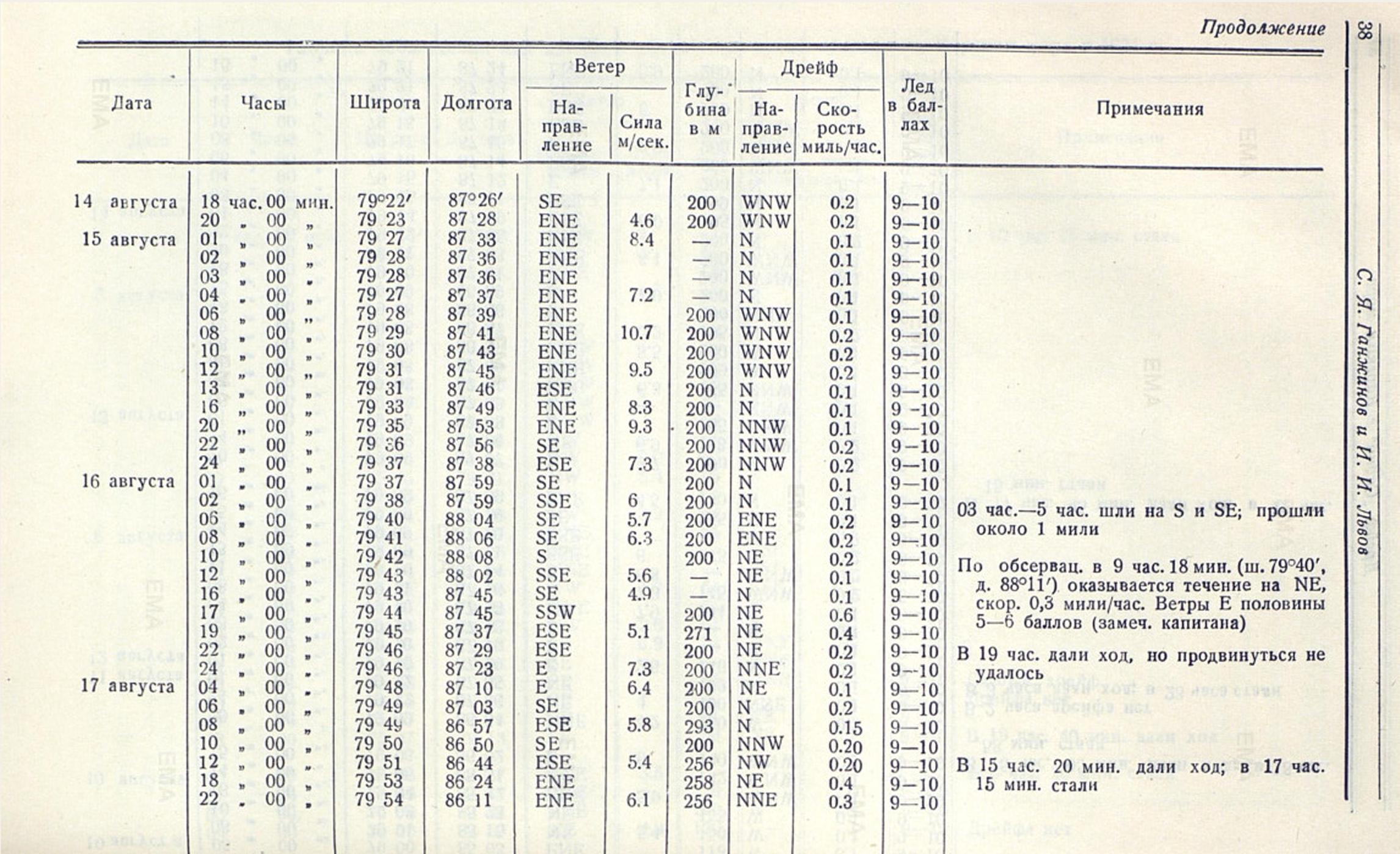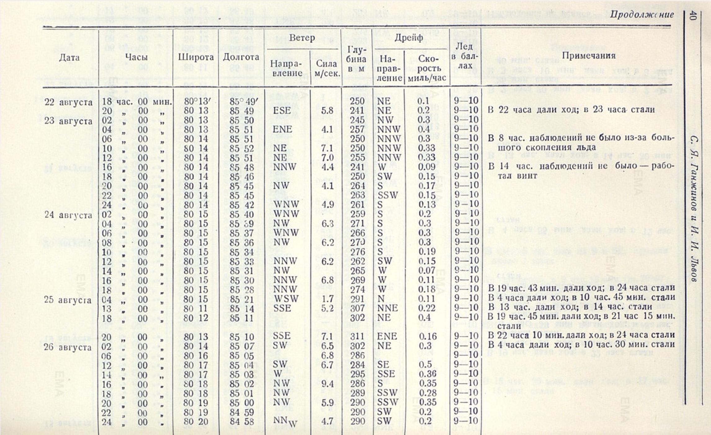* Необходимо заметить, что и последующие опорные пункты не особенно надежны. Обсервации по солнцу 4 августа сделаны при неблагоприятном горизонте и дали у гидрографа Е. С. Гернета и ст. пом. капитана Ножкина отличающиеся результаты. конечная точка дрейфа в 18 час. 6 августа получена обратной прокладкой от обсервации 7 августа. Наконец точка, где наблюдение дрейфа резко изменило свое направление с SW на (8 час. 6 августа), получена счислением и мало надежна, хотя судовая обсервация, произведенная в 11 час. 6 августа, совпала с ней.