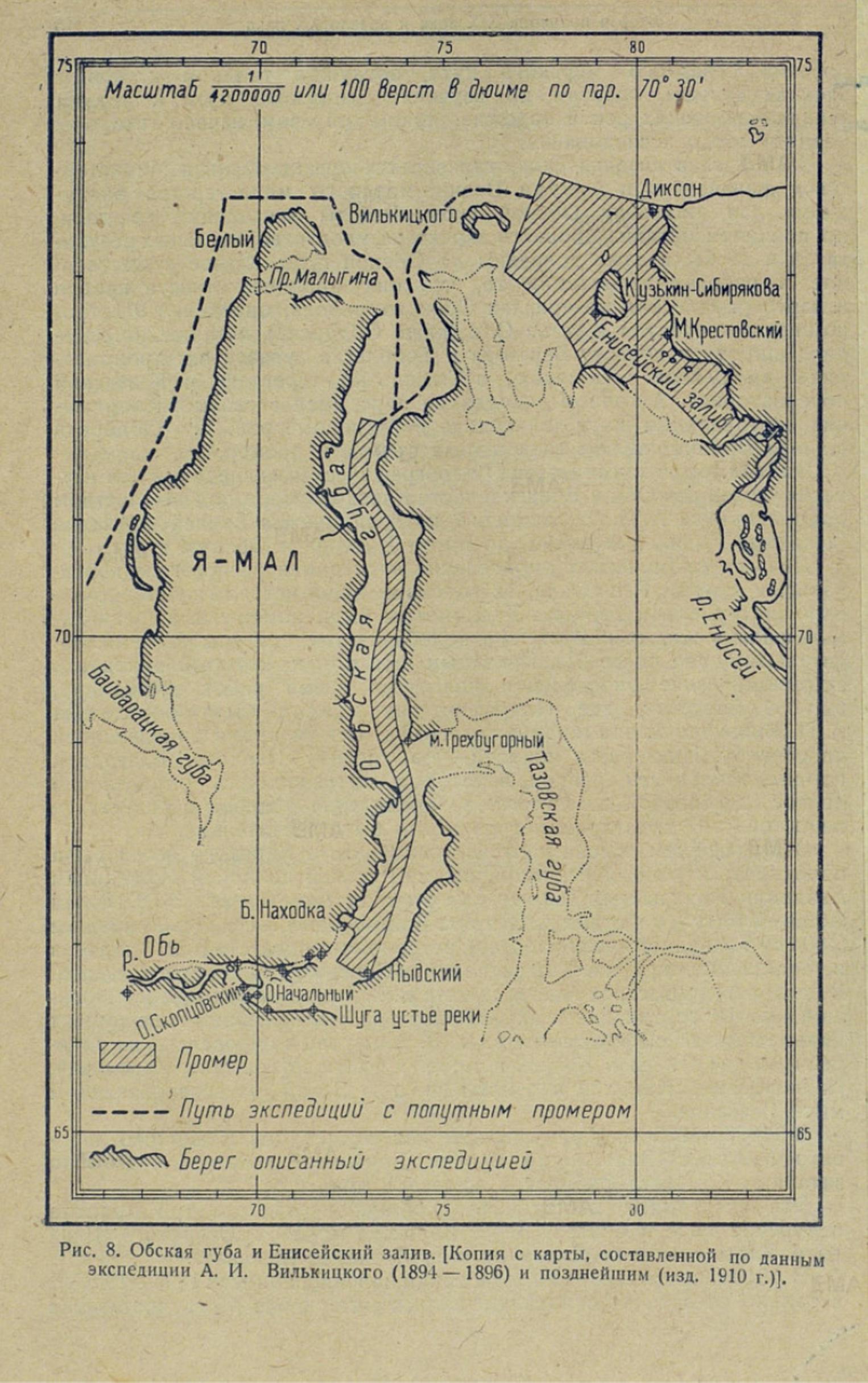 генеральная карта Обь-Енисейского залива, издававшаяся Главным гидрографическим управлением под № 763. Карта основана на 24 астрономических пунктах: 9 — А. И. Вилькицкого, 5 — В. В. Ахматова, 7 — В. Е. Фуса и 3 — Коломейцева (рис. 8).