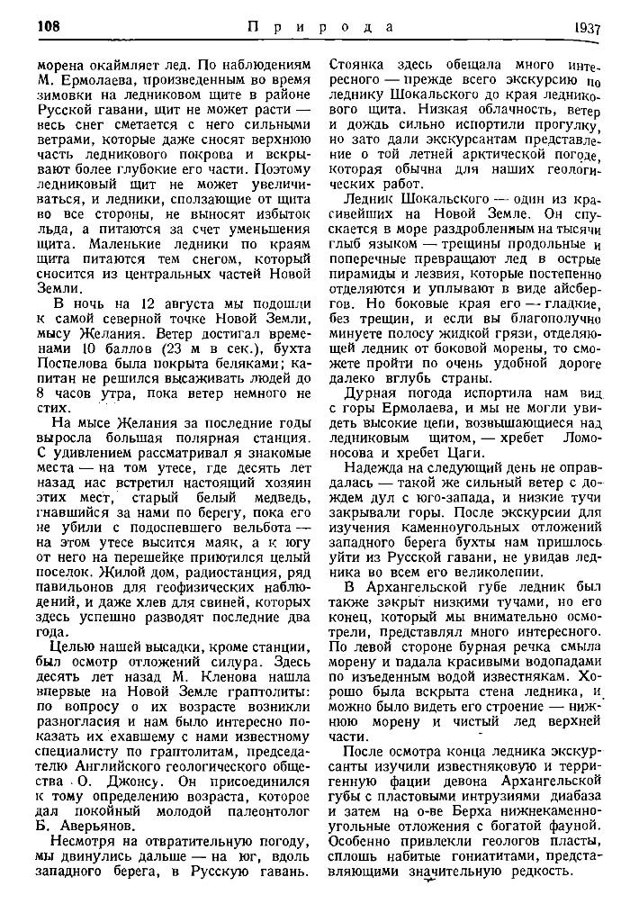 морена окаймляет лед. По наблюдениям М. Ермолаева, произведенным во время зимовки на ледниковом щите в районе Русской гавани, щит не может расти —-весь снег сметается с него сильными ветрами, которые даже сносят верхнюю часть ледникового покрова и вскрывают более глубокие его части. Поэтому ледниковый щит не может увеличиваться, и ледники, сползающие от щита во все стороны, не выносят избыток льда, а питаются за счет уменьшения щита. Маленькие ледники по краям щита питаются тем снегом, который сносится из центральных частей Новой Земли.