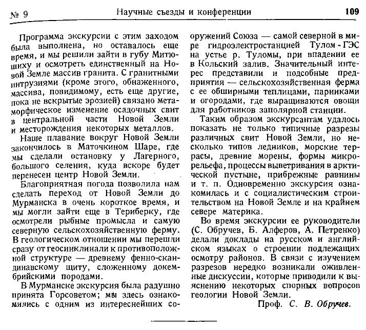 Таким образом экскурсантам удалось показать не только типичные разрезы различных свит Новой Земли, но несколько типов ледников, морские террасы, древние морены, формы микрорельефа, процессы выветривания в арктической пустыне, прибрежные равнины и т. п. Одновременно экскурсия ознакомилась и с социалистическим строительством на Новой Земле и на крайнем севере материка.