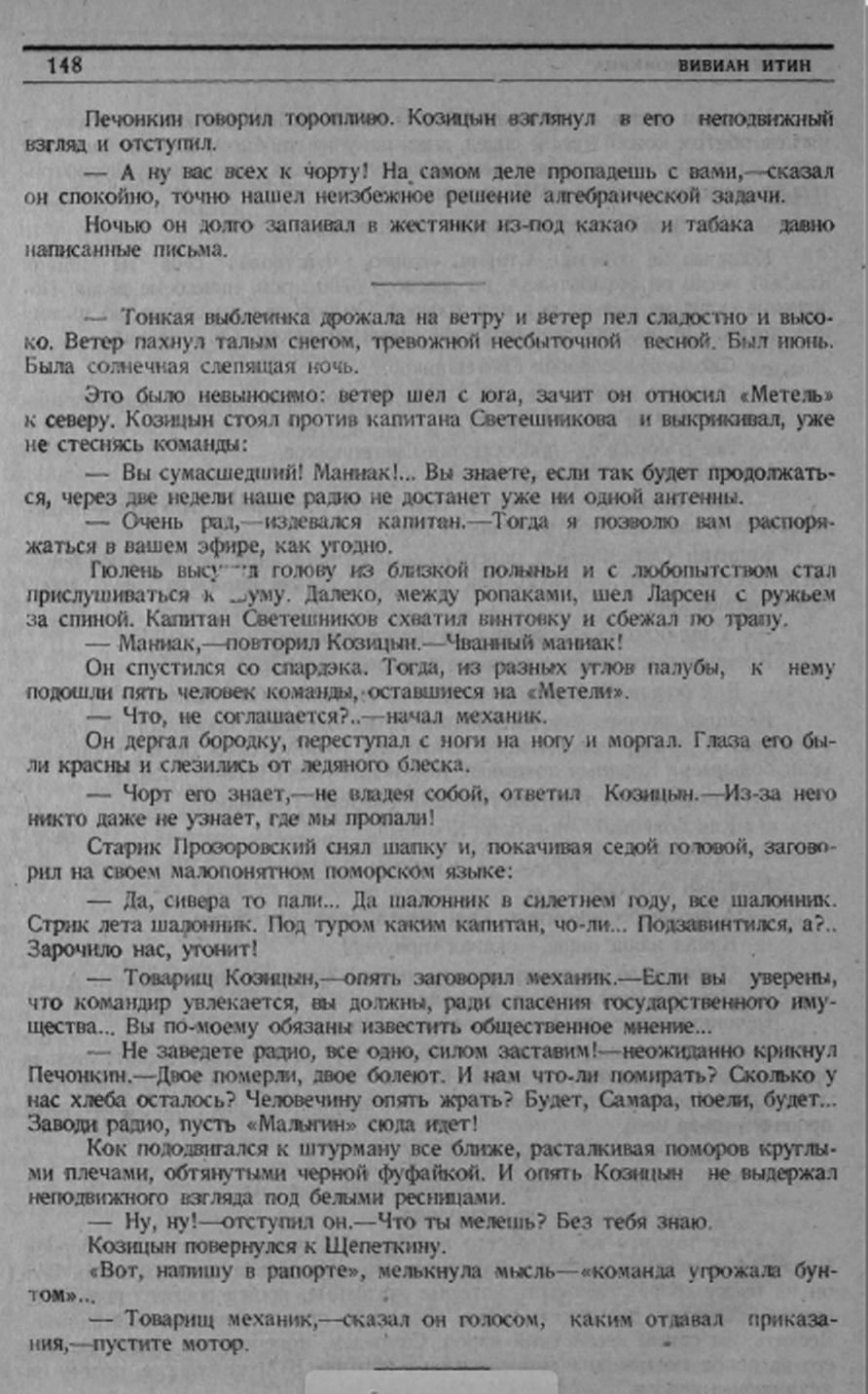 — Ну так что-же. Здесь его все знают. Служил он попом в «Черной Щели». А в двадцать первом году грусть его взяла: баба там, какая-то. Вот он на паску собрал самоедов, которые крещеные, пошел вокруг церкви и, вместо «Христос Воскресе», запел «Вставай проклятьем заклейменный». Дескать, вы самый несчастный народ. Самоедам, конечно, все равно. За это его из попов выставили и записался он в партию. В Архангельске потом на механика выучился...
