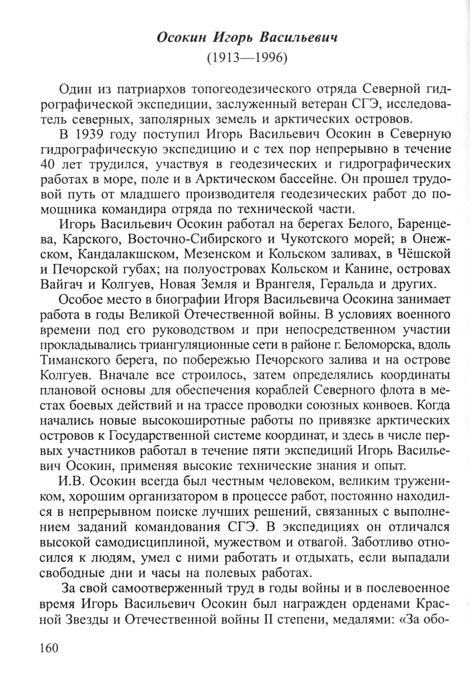 Один из патриархов топогеодезического отряда Северной гидрографической экспедиции, заслуженный ветеран СГЭ, исследователь северных, заполярных земель и арктических островов. В 1939 году поступил Игорь Васильевич Осокин в Северную гидрографическую экспедицию и с тех пор непрерывно в течение 40 лет трудился, участвуя в геодезических и гидрографических работах в море, поле и в Арктическом бассейне. Он прошел трудовой путь от младшего производителя геодезических работ до помощника командира отряда по технической части.