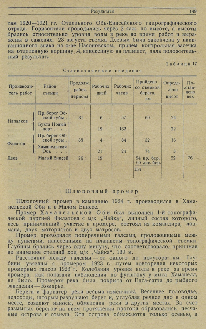 Промер Хаманельской Оби был выполнен 1-й топографической партией Филатова с м/к „Чайка", личный состав которого, весь принимавший участие в промере, состоял из командира, лоцмана, двух мотористов и двух матросов.