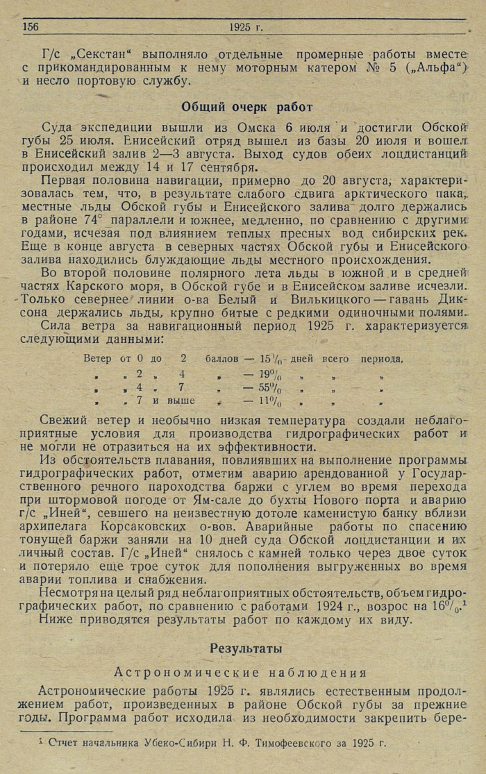 Во второй половине полярного лета льды в южной и в средней частях Карского моря, в Обской губе и в Енисейском заливе исчезли. Только севернее линии о-ва Белый и Вилькицкого — гавань Дик­сона держались льды, крупно битые с редкими одиночными полями. Сила ветра за навигационный период 1925 г. характеризуется следующими данными: