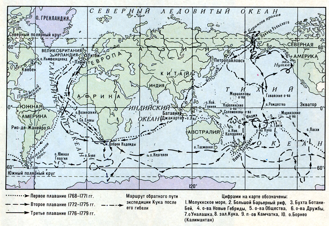 Трижды корабли под его командованием обогнули земной шар, шесть раз переходили экватор. Кук впервые в истории пересек Южный полярный круг, Кук стал первым человеком, побывавшим и в Арктике, и в Антарктике, он воистину "избороздил" весь мир.