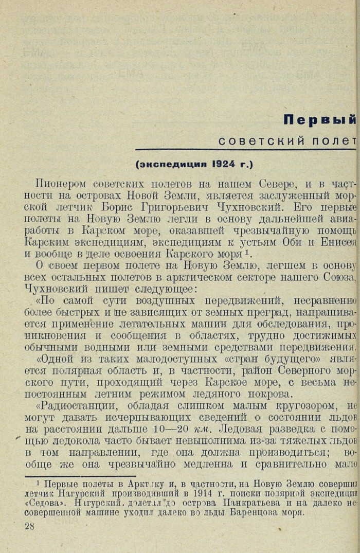 Пионером советских полетов на нашем Севере, и в частности на островах Новой Земли, является заслуженный морской летчик Борис Григорьевич Чухновский. Его первые полеты на Новую Землю легли в основу дальнейшей авиаработы в Карском море, оказавшей чрезвычайную помощь Карским экспедициям, экспедициям к устьям Оби и Енисея и вообще в деле освоения Карского моря {1}.