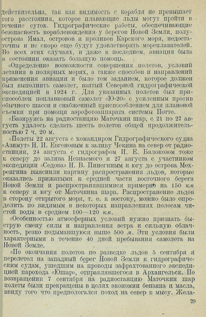 большое пространство береговой полосы не может быть одновременно закрыто атмосферными осадками, делающими невозможным возвращение самолета на базу, -а также изрезанность берегов Новой Земли хорошо защищенными бухтами и заливами, в которых всегда можно найти защиту от непогоды. Для разведки льдов в открытом море основными требованиями, которые нужно предъявлять к самолету, являются: большая мореходность, возможно меньший пробег при взлете и посадке и надежность работы мотора. Большая скорость полета не только не является необходимой, но даже может мешать при изыскании подводных опасностей и наблюдении характера льдов. Радиус действия самолета для разведки льдов в Карском море должен быть равен примерно 400—450 км. В помощь гидрографическим работам целесообразнее всего применять самолеты, передавая их береговым партиям для рекогносцировочных целей при триангуляции и промерных работах. В случае же производства промера судами или похода последних в районы, угрожаемые тяжелыми льдами, самолеты должны базироваться на суда».
