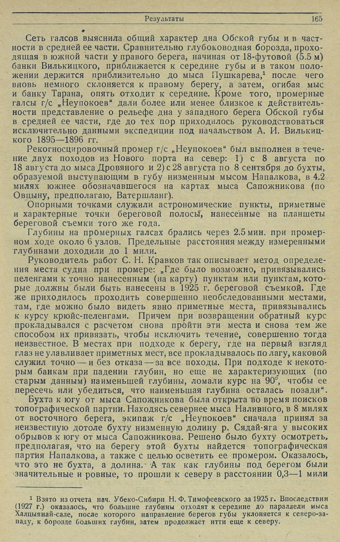 В результате промеров г/с „Неупокоев" в средней части Обской губы обнаружена опасная коса у мыса Наливного, существование которой предполагалось, но положение которой не было известно. Открыта бухта у мыса Сапожникова, приглубая и удобная как убежище от ветров нордовой половины горизонта.