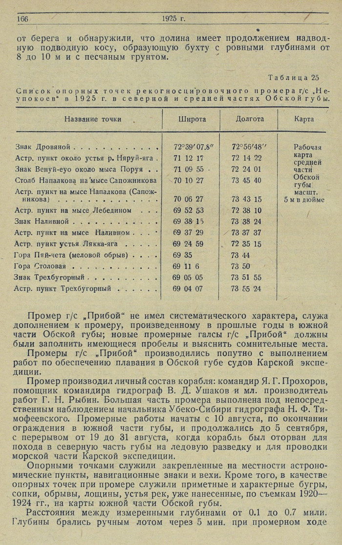 Список опорных точек рекогносцировочного промера г/с "Неупокоев" в 1925 г. в северной и средней частях Обской губы.