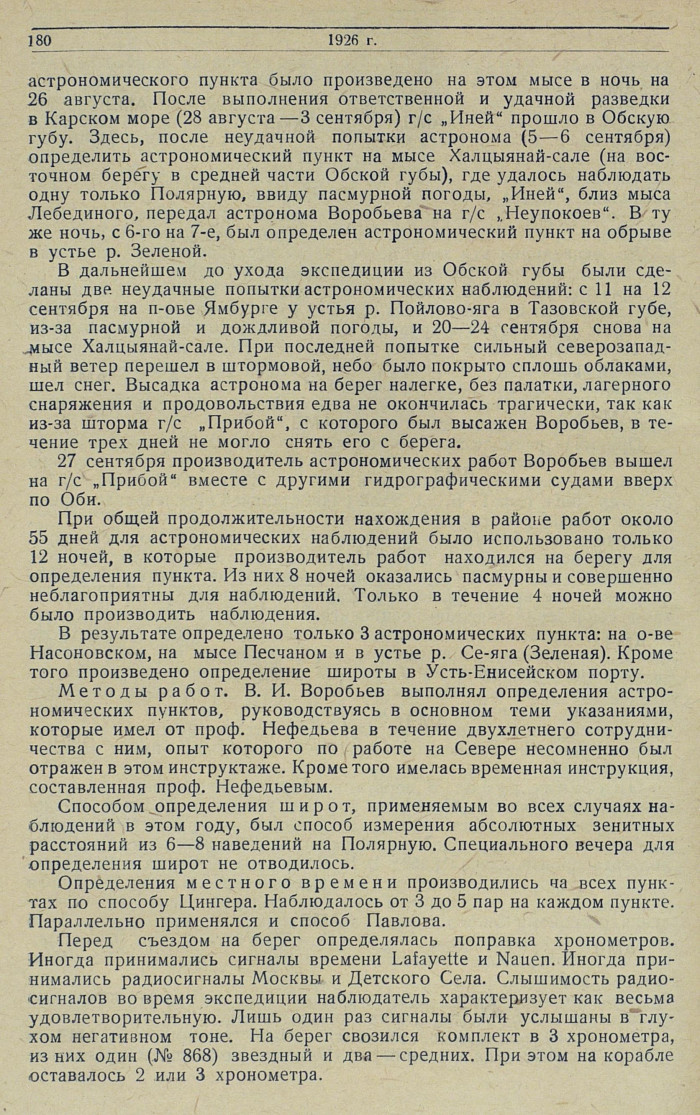Методы работ. В.И. Воробьев выполнял определения астрономических пунктов, руководствуясь в основном теми указаниями, которые имел от проф. Нефедьева в течение двухлетнего сотрудничества с ним, опыт которого по работе на Севере несомненно был отражен в этом инструктаже. Кроме того имелась временная инструкция, составленная проф. Нефедьевым.