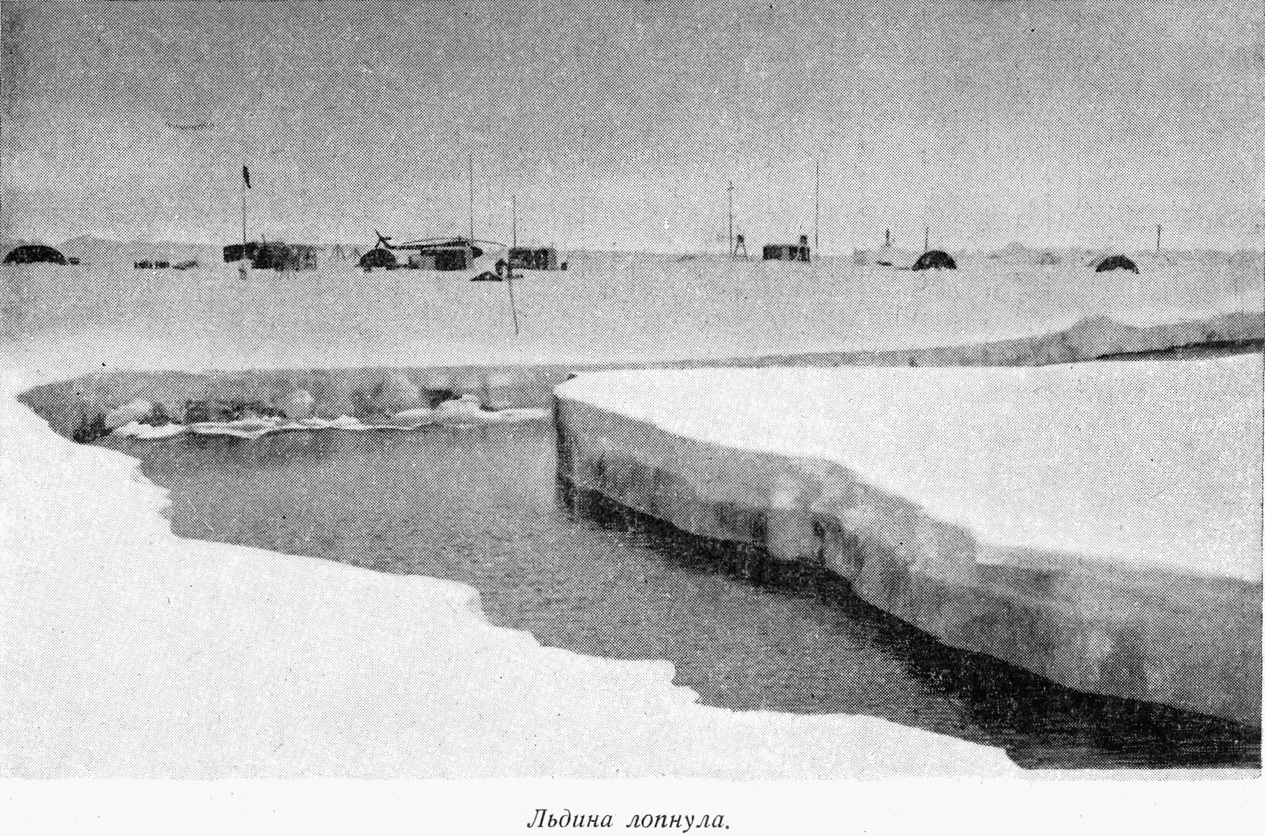 Вскоре обнаружились новые трещины в районе гидрологических палаток. Катастрофа могла произойти в любую минуту, и Гудкович, не теряя времени на разогрев моторов, с помощью товарищей вручную поднял вертушки на поверхность и унес в лабораторию.