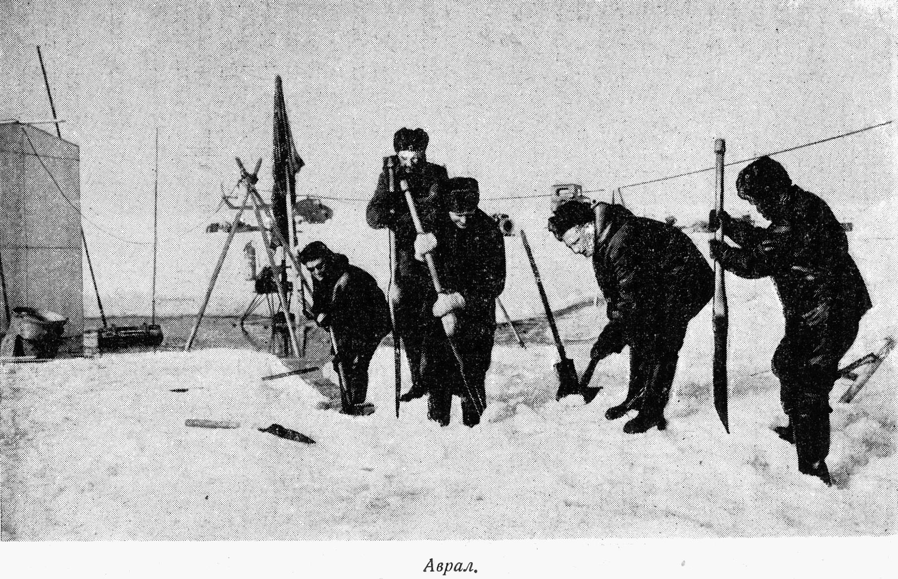 Установка мачты и монтаж оборудования осуществлялись при 45-градусном морозе и ветре скоростью до 10 м/сек. Но, несмотря на это, работы были закончены в короткий срок, и после непродолжительного перерыва наблюдения возобновились в прежнем объеме.