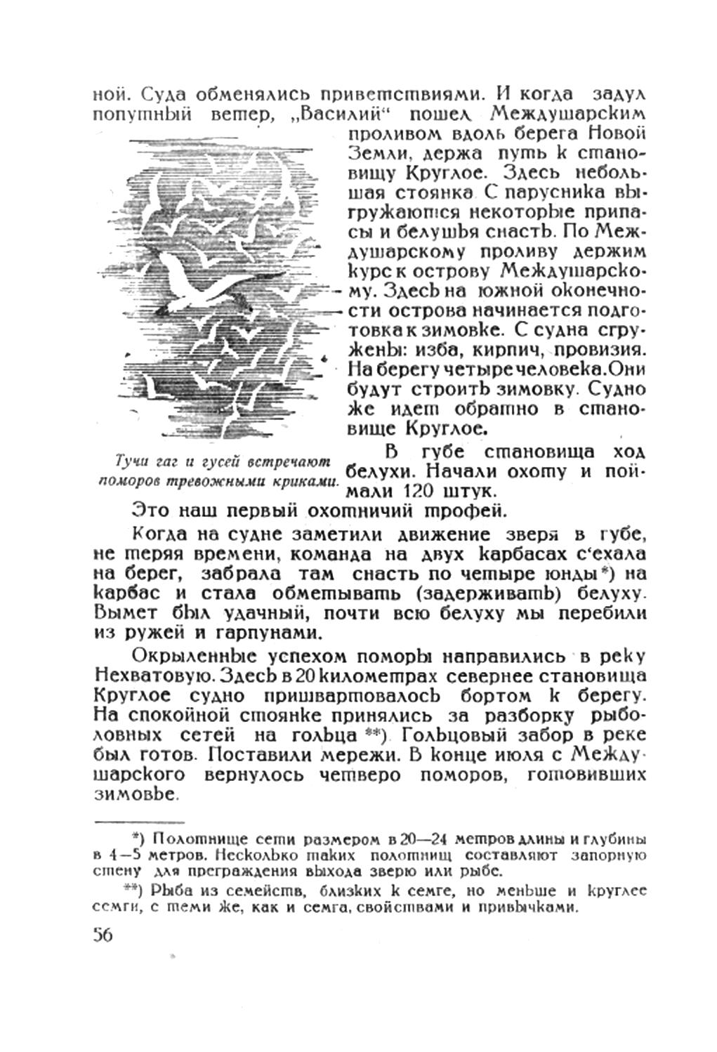 *) Рулевой, помощник капитана на судне-паруснике.**) Отклонение судна от намеченного пути под влиянием ветра, течения, сильной волны.... Тучи гаги гусей встречают поморов тревожными криками.