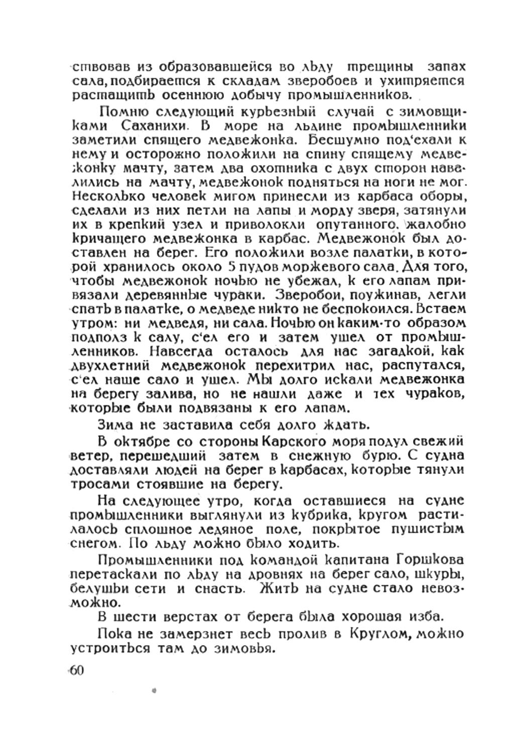 Нужда и голод гнали на борьбу за неистощимее богатства Севера, в рискованные заполярные плавания сотни поморов-промыш-ленников. К числу их принадлежал и я. Еще 16-летним юношей отправился я на утлом паруснике кемского купца-судопромышленника Норкина матросом на промыслы, на зимовку к берегам Новой Земли.