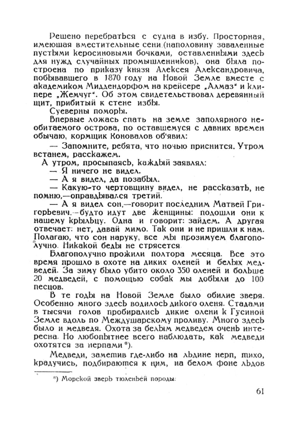 В те годы на Новой Земле было обилие зверя. Особенно много здесь водилось дикого оленя. Сталами в тысячи голов пробирались дикие олени к Гусиной Земле вдоль по Междушарскому проливу. Много здесь было и медведя. Охота за белым медведем очень интересна. Но любопытнее всего наблюдать, как медведи охотятся за нерпами*).