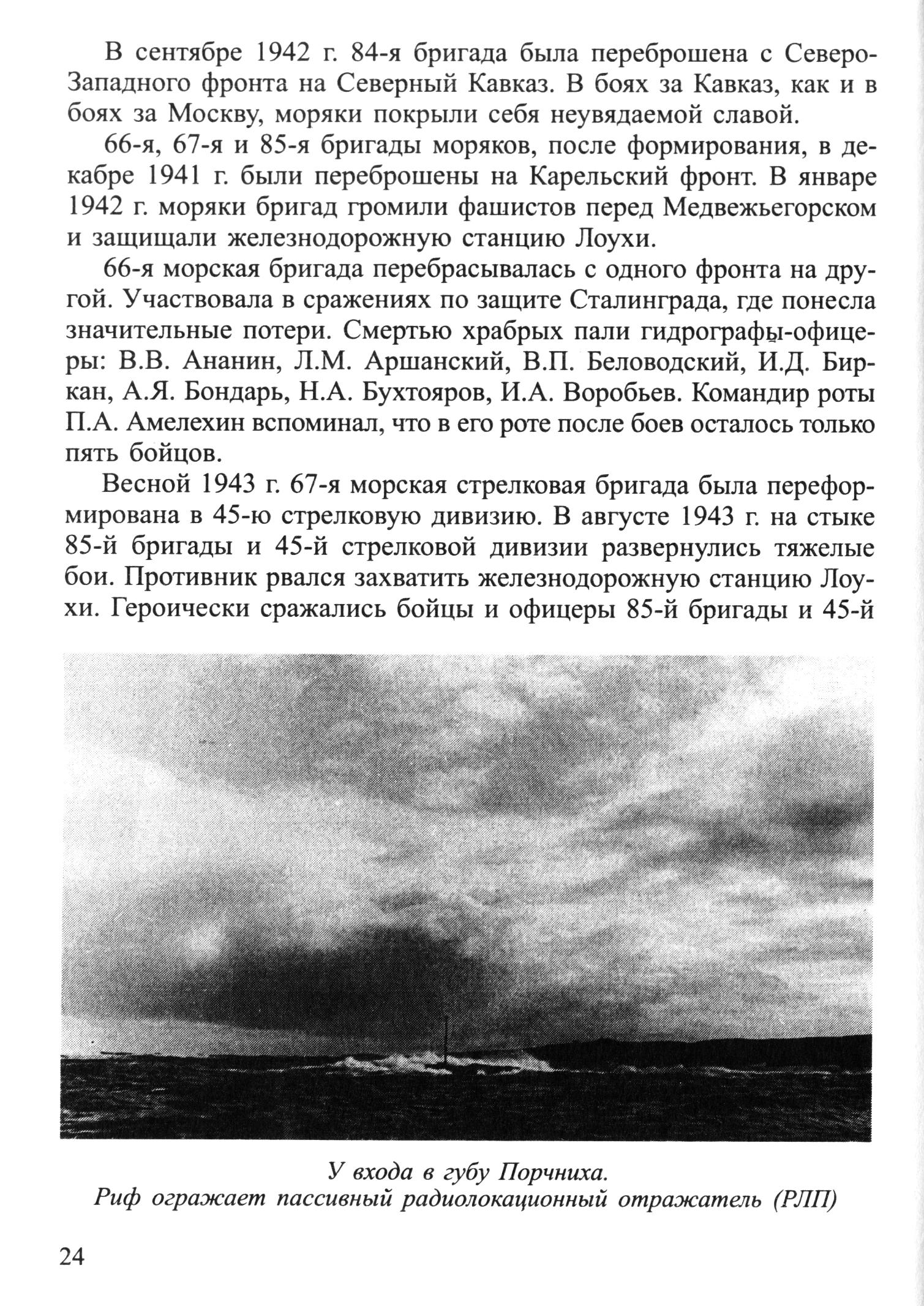 66-я морская бригада перебрасывалась с одного фронта на другой. Участвовала в сражениях по защите Сталинграда, где понесла значительные потери. Смертью храбрых пали гидрографы-офицеры: В.В. Ананин, Л.М. Аршанский, В.П. Беловодский, И.Д. Биркан, А.Я. Бондарь, Н.А. Бухтояров, И.А. Воробьев. Командир роты П.А. Амелехин вспоминал, что в его роте после боев осталось только пять бойцов.