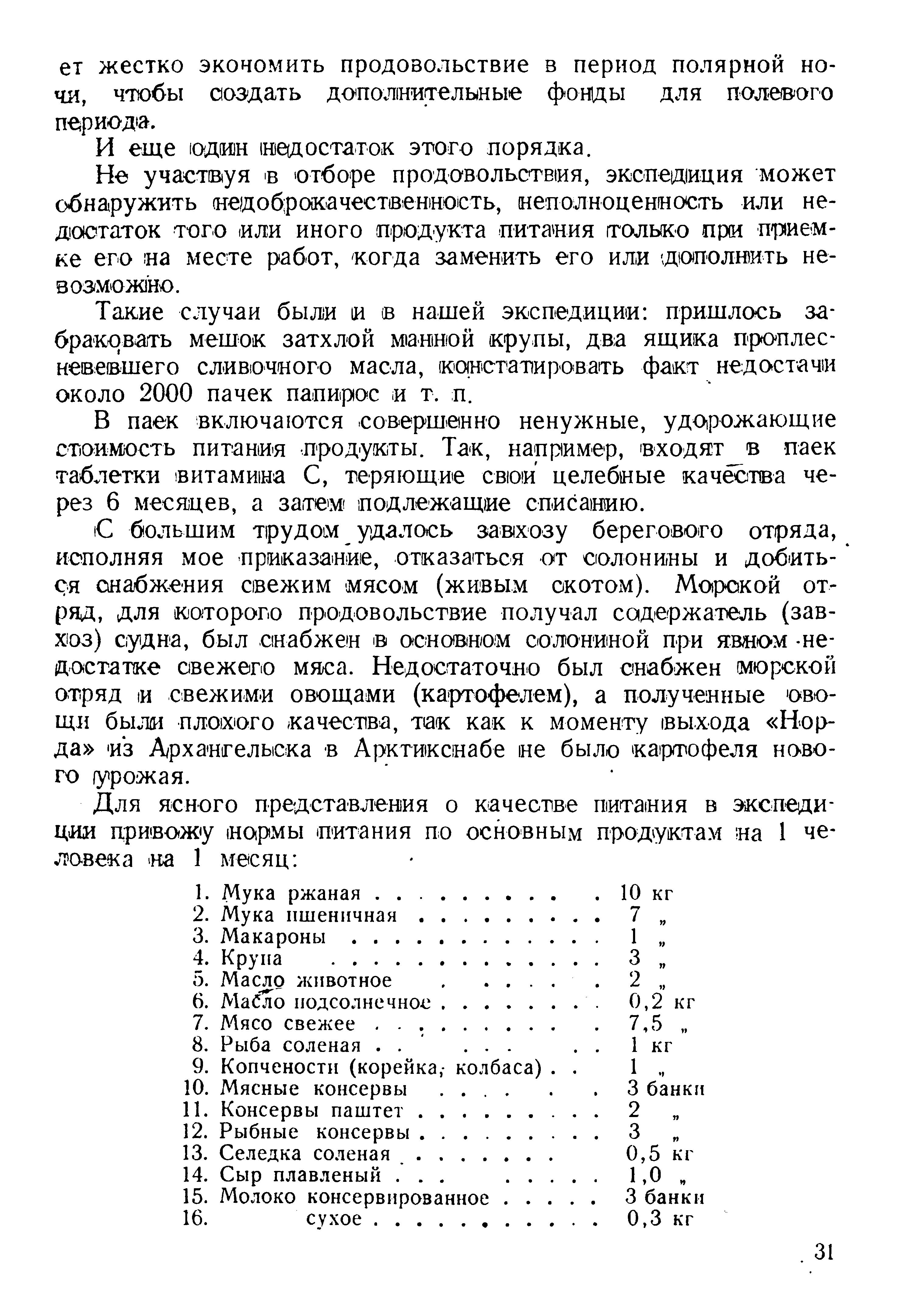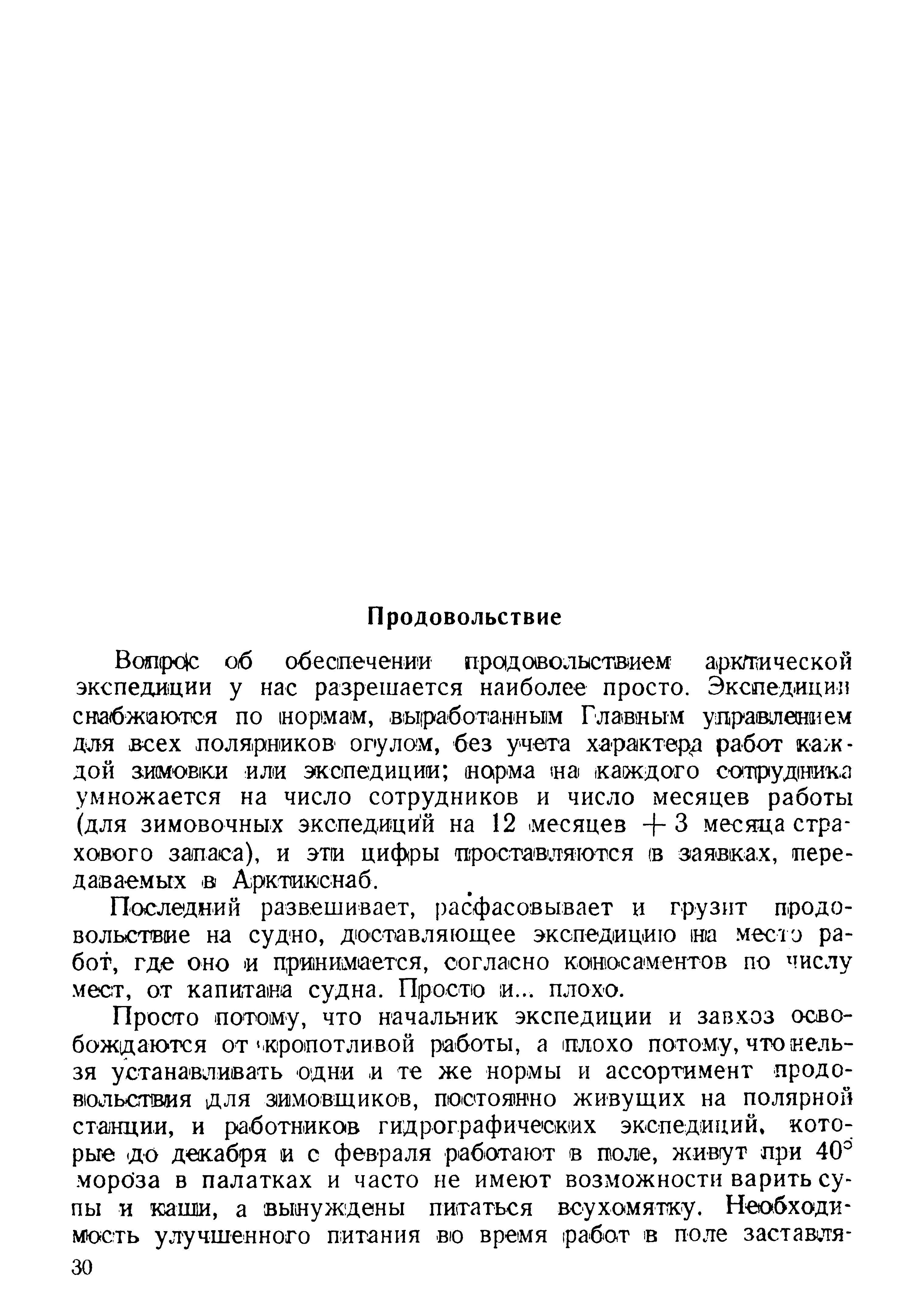 Вопрос об обеспечении продовольствием арктической экспедиции у нас разрешается наиболее просто. Экспедиции снабжаются по нормам, выработанным Главным управлением для всех полярников огулом, без учета характера работ каждой зимовки или экспедиции; норма на каждого сотрудника умножается на число сотрудников и число месяцев работы (для зимовочных экспедиций на 12 месяцев +3 месяца страхового запаса), и эти цифры проставляются (в заявках, передаваемых в Арктикснаб.