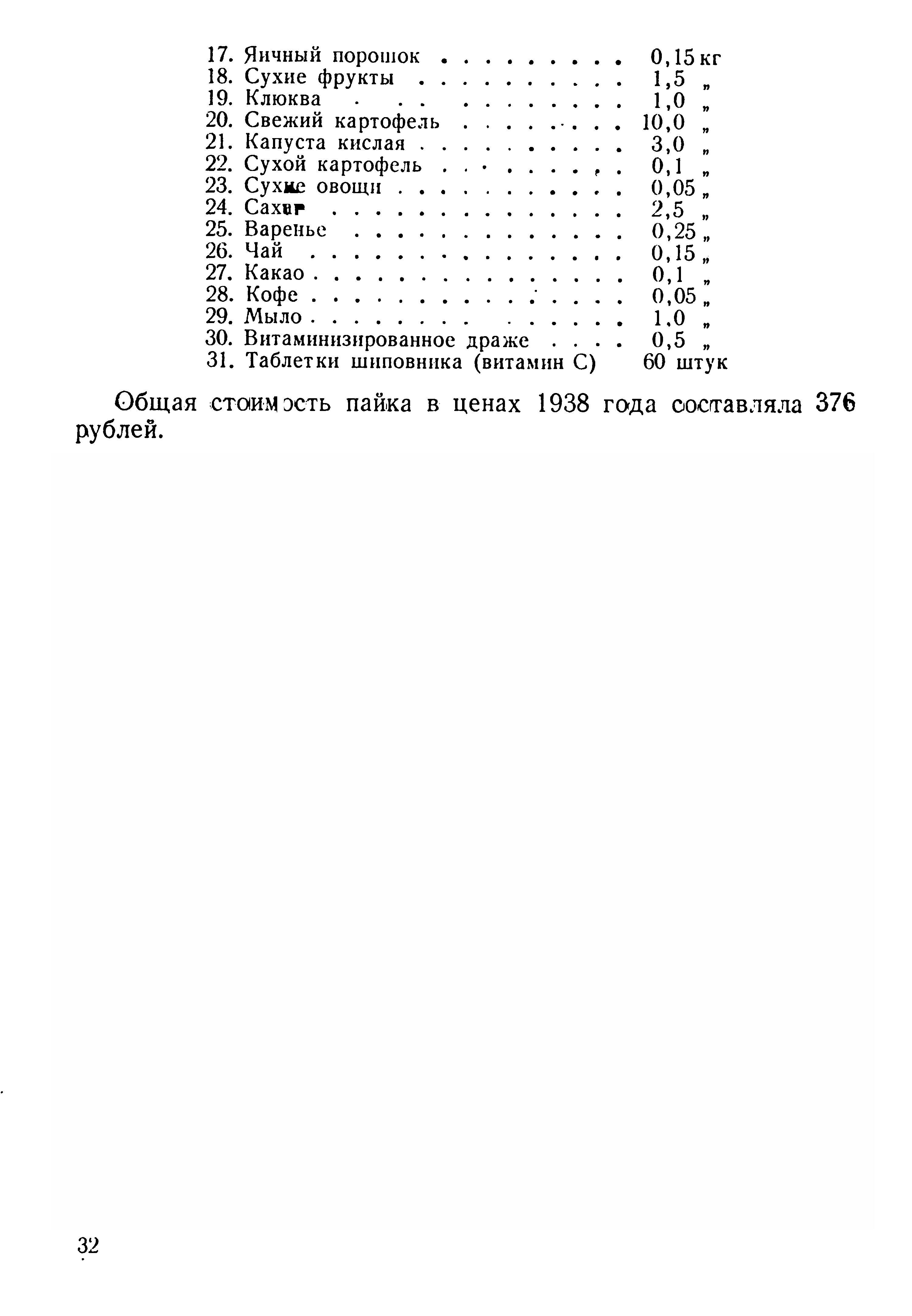 Общая стоимость пайка в ценах 1938 года составляла 376 рублей.