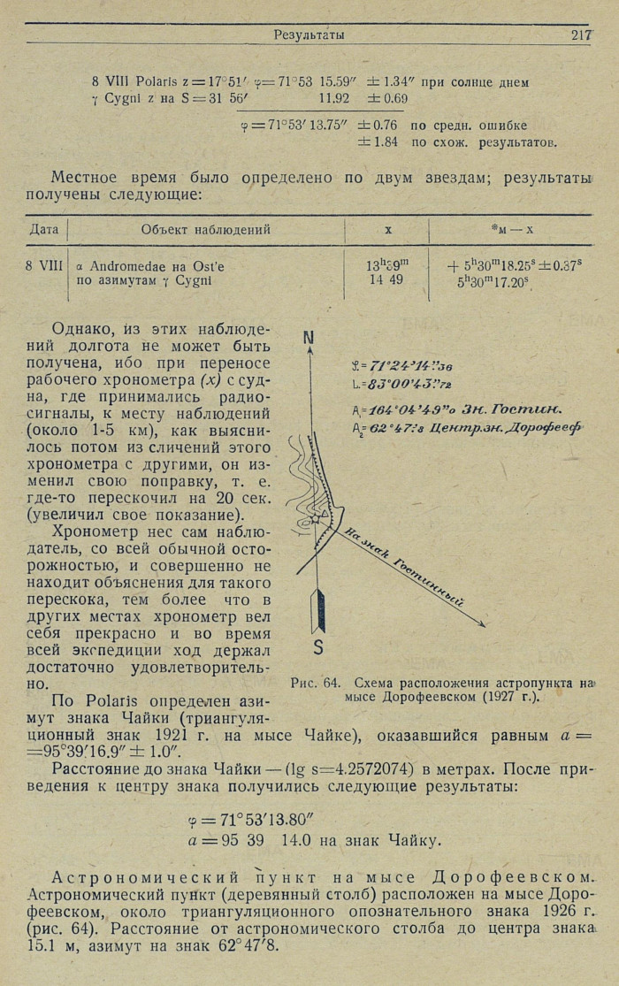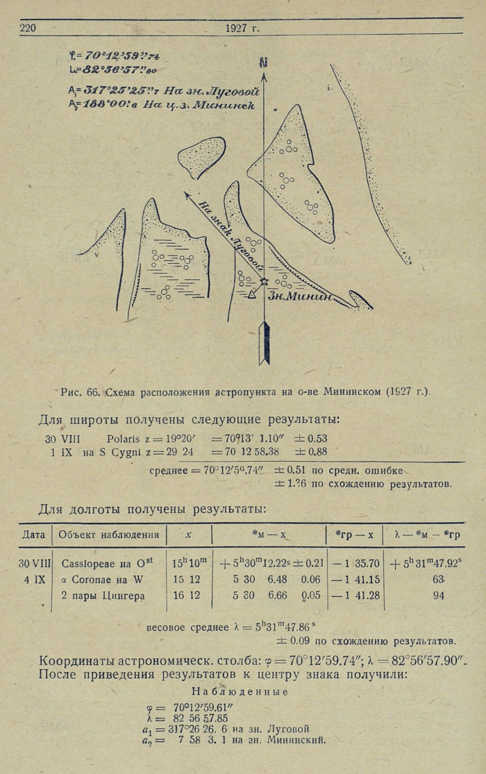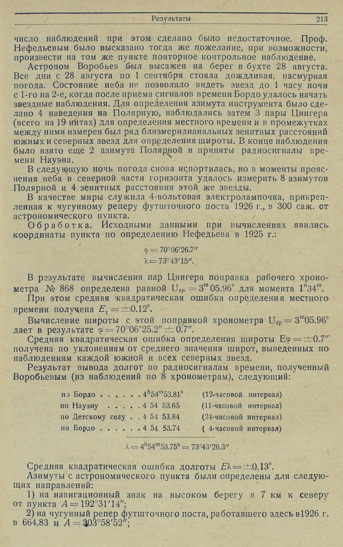 Обработка. По результатам наблюдений 22—23 июля: азимут инструмента из 8 наведений на Полярную = ±15'24.3", при отсчете на миру 358°29'01.6"; широта из 8 зенитных расстояний Полярной = 76°35'36.2".
