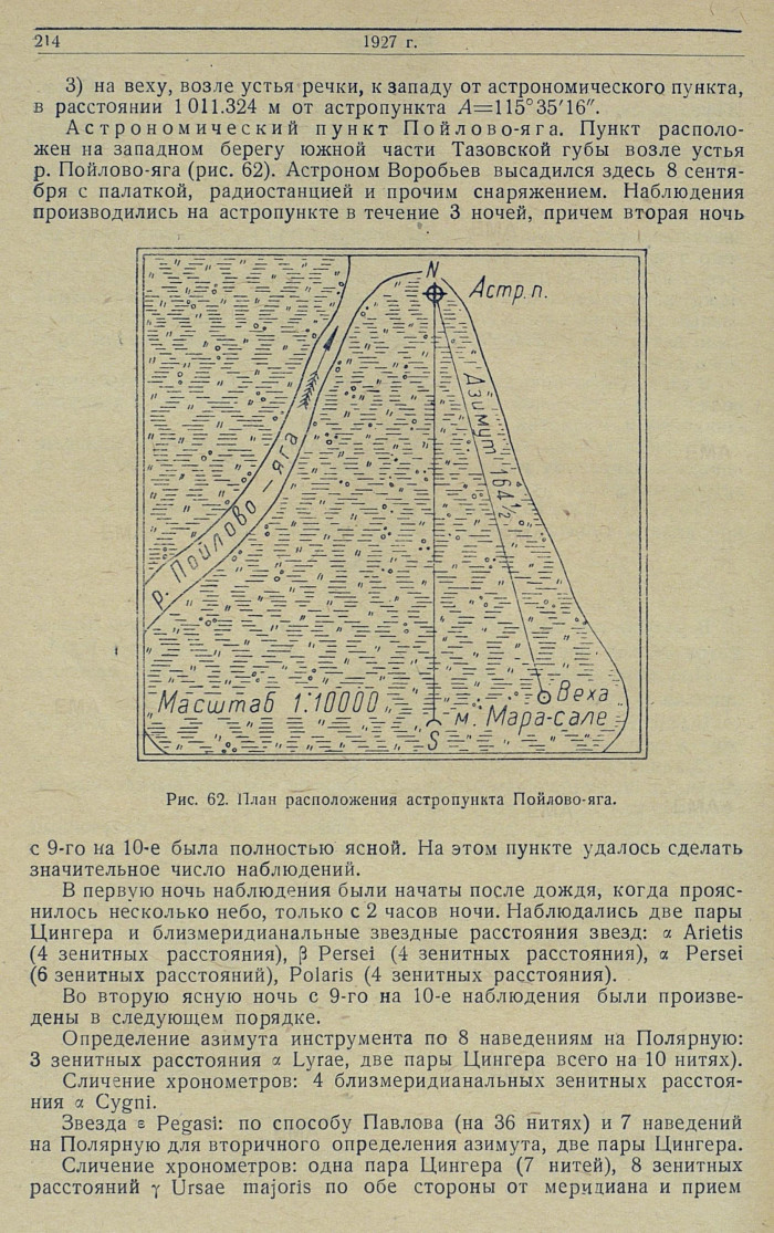 Надлежало дать основу для северных границ съемки. По ходу работ и обстоятельствам плавания явилась возможность эту границу отодвинуть несколько к северу, в силу чего астрономический пункт, вместо мыса Полуденного, был определен у р. Болотной, а вместо Штормового — у мыса Няр-салем-пые и на восточном берегу р. Тид-Нгыдэ-яга, впадающей в Обскую губу (на картах здесь была показана бухта Варпай). На участках съемки прошлого года были определены пункты в устье р. Сэр-яга на западном берегу, на мысе Халцыянай-сале и повторно на мысе Напалкова. Кроме того, попутно с рейсом судна, ходившего в Тазовскую губу был определен пункт на п-ове Ямбур у р. Пойлово-яга.
