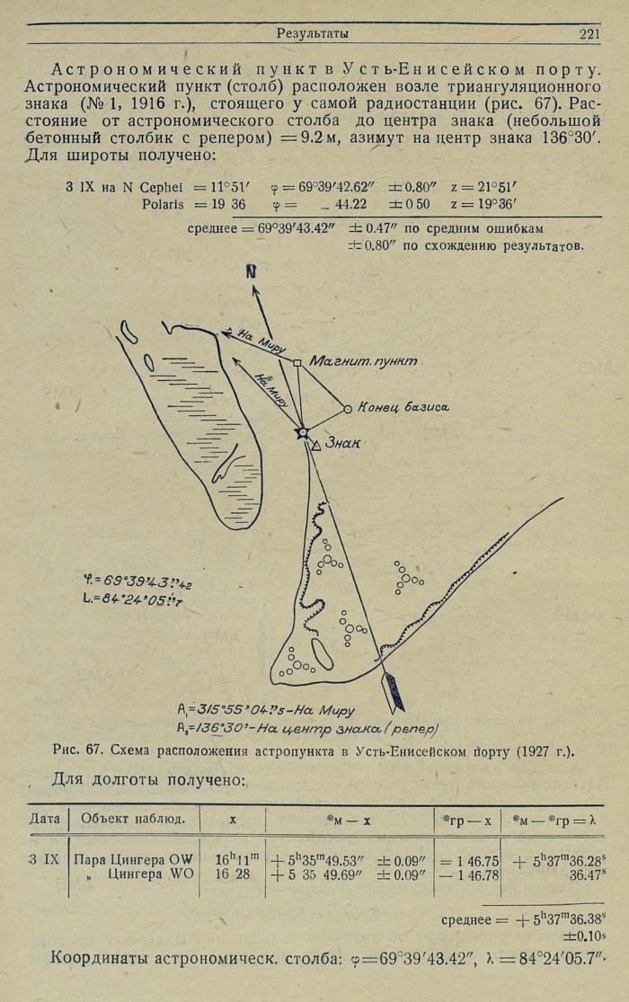 Астрономический пункт в Усть-Енисейском порту. Астрономический пункт (столб) расположен возле триангуляционного знака (№ 1, 1916 г.), стоящего у самой радиостанции (рис.67). Расстояние от астрономического столба до центра знака (небольшой бетонный столбик с репером) = 9.2 м, азимут на центр знака 136°30'. Для широты получено: