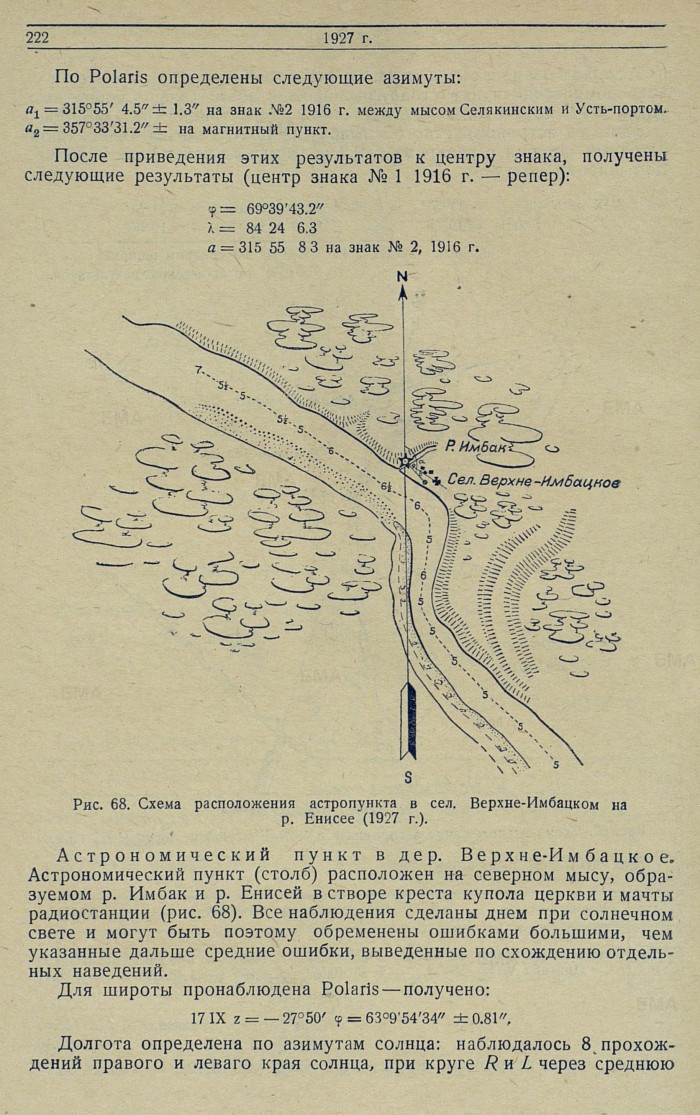 Астрономический пункт в дер. Верхне-Имбацкое. Астрономический пункт (столб) расположен на северном мысу, образуемом р. Имбак и р. Енисей в створе креста купола церкви и мачты радиостанции (рис. 68). Все наблюдения сделаны днем при солнечном свете и могут быть поэтому обременены ошибками большими, чем указанные дальше средние ошибки, выведенные по схождению отдельных наведений.