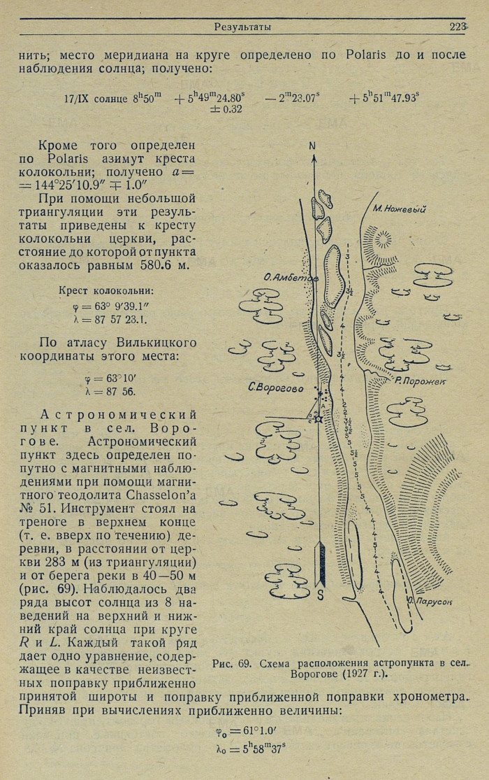 Астрономический пункт в сел. Βοροгове. Астрономический пункт здесь определен попутно с магнитными наблюдениями при помощи магнитного теодолита Chasselon’a № 51. Инструмент стоял на треноге в верхнем конце (т. е. вверх по течению) деревни, в расстоянии от церкви 283 м (из триангуляции) и от берега реки в 40—50 м (рис. 69). Наблюдалось два ряда высот солнца из 8 наведений на верхний и нижний край солнца при круге R и L. Каждый такой ряд дает одно уравнение, содержащее в качестве неизвестных поправку приближенно принятой широты и поправку приближенной поправки хронометра. Приняв при вычислениях приближенно величины: