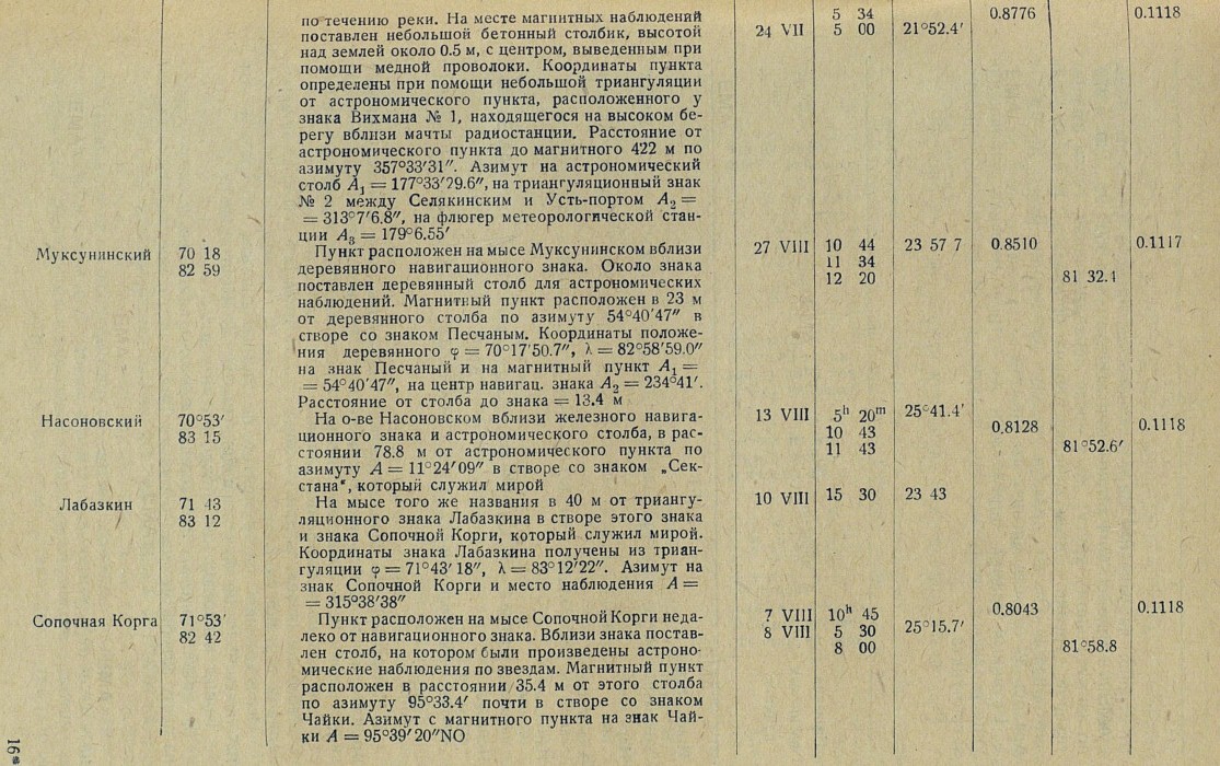 Муксунинский 70°18' 82°59' Пункт расположен на мысе Муксунинском вблизи деревянного навигационного знака. Около знака поставлен деревянный столб для астрономических наблюдений. Магнитный пункт расположен в 23 м от деревянного столба по азимуту 54°40'47" в створе со знаком Песчаным. Координаты положения деревянного φ = 70°17'50.7", λ = 82°58'59.0" на знак Песчаный и на магнитный пункт А1 = = 54°40'47", на центр навигац, знака А2 = 234°41'. Расстояние от столба до знака = 13.4 м 27 VIII 10h44m 11h34m 12h20m 23°57.7' 0.8510 81°32.1' 0.1117