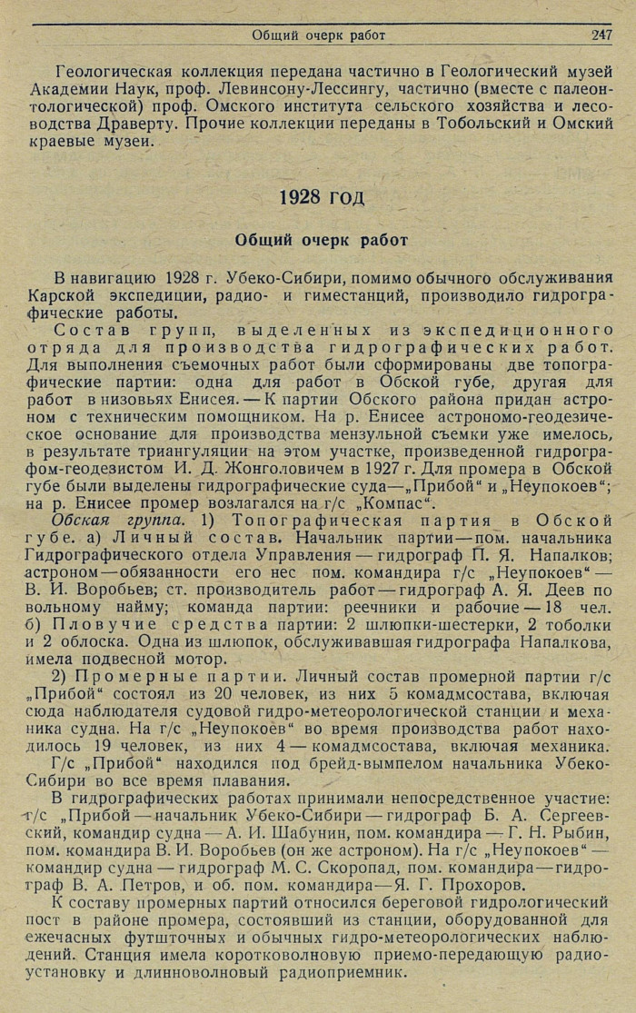 В гидрографических работах принимали непосредственное участие: г/с „Прибой — начальник Убеко-Сибири — гидрограф Б. А. Сергеевский, командир судна — А. И. Шабунин, пом. командира — Г. Н. Рыбин, пом. командира В. И. Воробьев (он же астроном). На г/с „Неупокоев" — командир судна — гидрограф М. С. Скоропад, пом. командира — гидрограф В. А. Петров, и об. пом. командира — Я. Г. Прохоров.