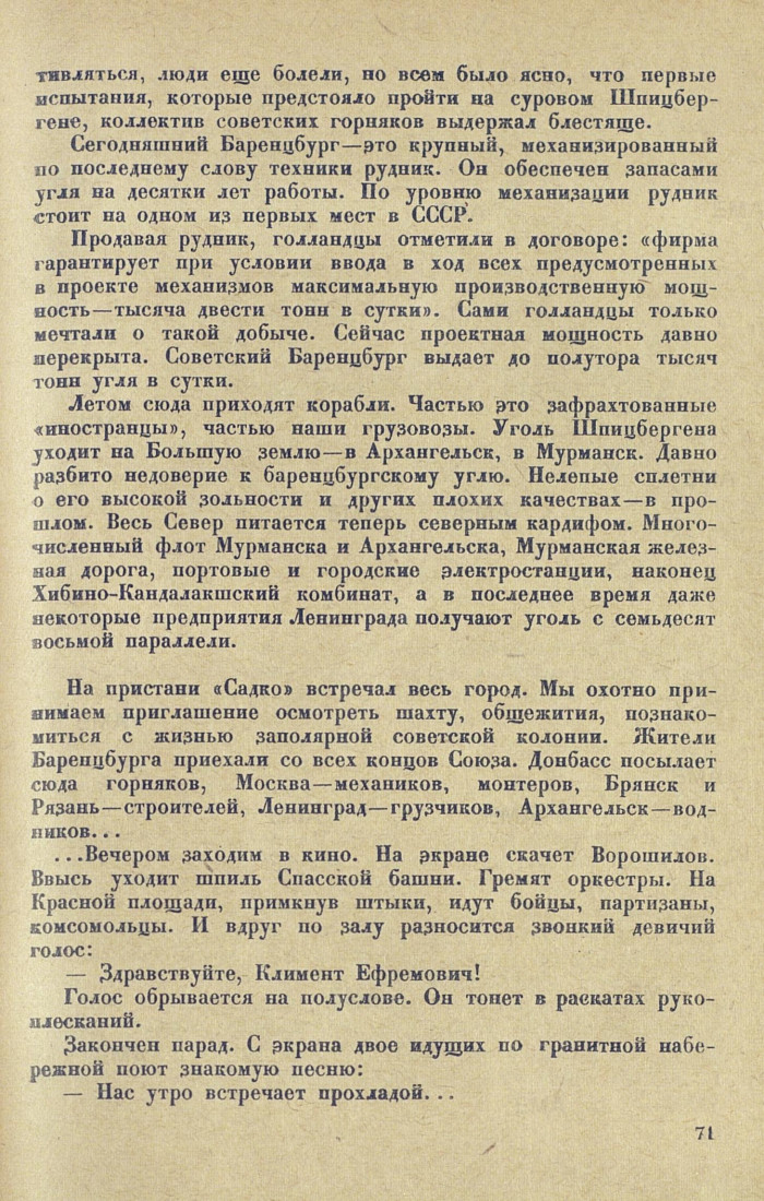 На пристани «Садко» встречал весь город. Мы охотно принимаем приглашение осмотреть шахту, общежития, познакомиться с жизнью заполярной советской колонии. Жители Баренцбурга приехали со всех концов Союза. Донбасс посылает сюда горняков, Москва — механиков, монтеров, Брянск и Рязань — строителей, Ленинград — грузчиков, Архангельск — водников...