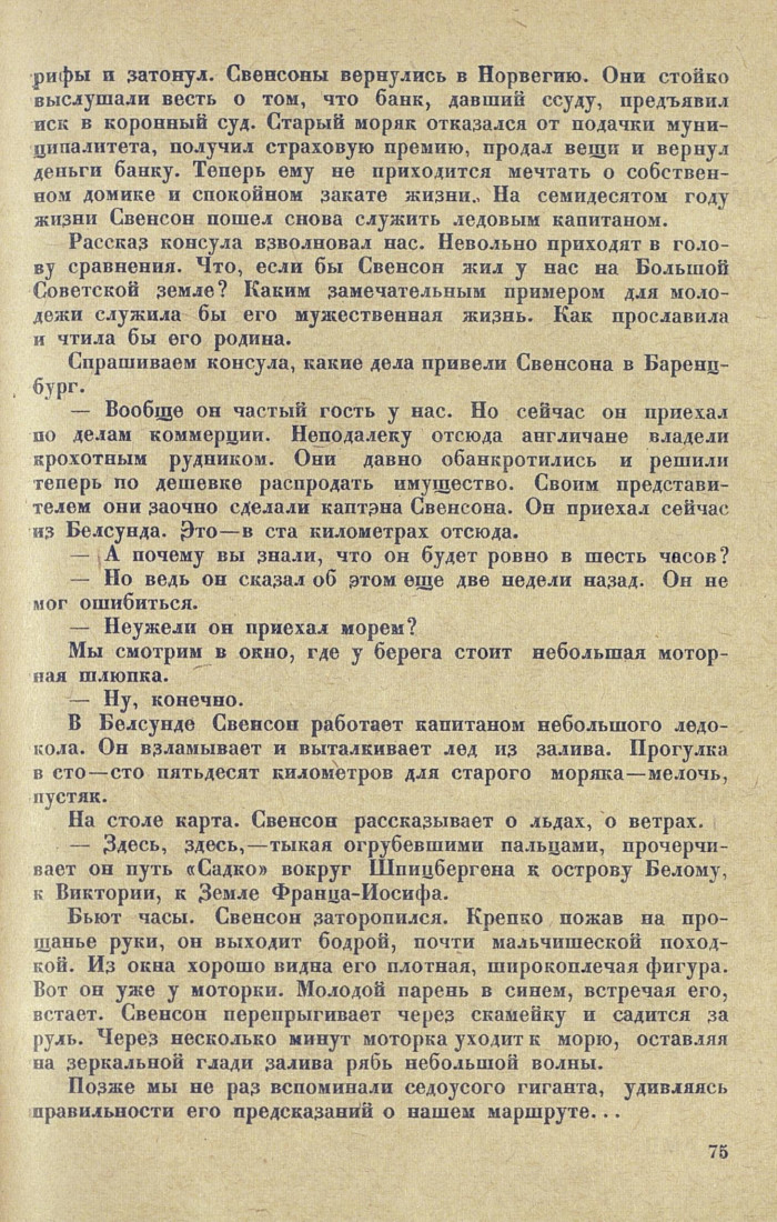 — Ему семьдесят два года. Полвека он отдал плаванию в северных морях. Трудно найти лучшего знатока извилистых фиордов Шпицбергена. Свенсон был матросом, боцманом, ледовым капитаном. Его знает вся Норвегия. Он был участником экспедиции Амундсена и Нансена, прославивших норвежский народ.