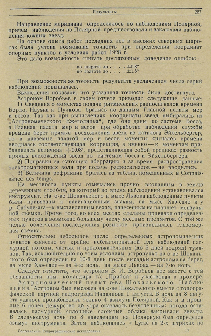 Наблюдения. Астроном был высажен на пункт с г/с „Прибой“ 30 августа утром. Условия для наблюдения вечером были неблагоприятны. Надежно определить азимут инструмента для наблюдений времени не удалось. В эту первую ночь главное внимание было обращено на наблюдения для определения широты. 31 августа вечером наблюдалась для широты а Lyrae и произведено определение азимута инструмента по 18 наведениям на Полярную. Дальнейшее дежурство у инструмента оказалось безрезультатным: сплошные тучи закрывали звезды. 1 сентября наблюдения были невозможны. 2 сентября, после приема радиосигналов, около 10 часов начаты звездные наблюдения, причем основное внимание было обращено на определение поправки хронометра относительно местного времени для вывода долготы. Утром 3 сентября к 8 часам астроном был принят на борт пришедшего г/с „Прибой".