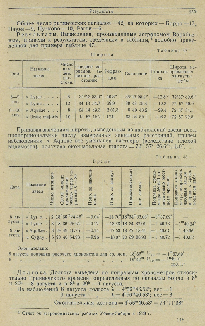 Результаты. Вычисления, произведенные астрономом Воробьевым, привели к результатам, сведенным в таблицы, {1} подобно приведенной для примера таблице 47.