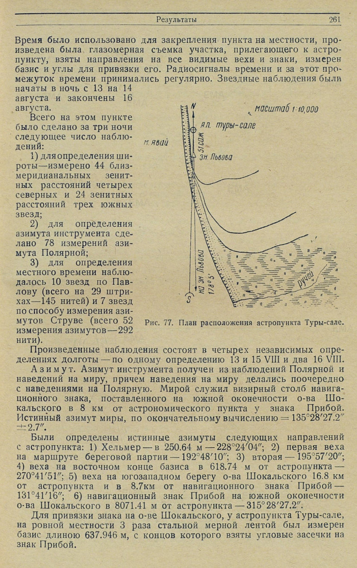 Азимут. Азимут инструмента получен из наблюдений Полярной и наведений на миру, причем наведения на миру делались поочередно с наведениями на Полярную. Мирой служил визирный столб навигационного знака, поставленного на южной оконечности о-ва Шокальского в 8 км от астрономического пункта у знака Прибой. Истинный азимут миры, по окончательному вычислению = 135°28'27.2" ± 2.7".