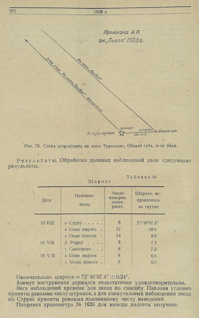 На основе опыта работ последних лет в высоких северных широтах была учтена возможная точность при определении координат опорных пунктов в условиях работ 1928 г.