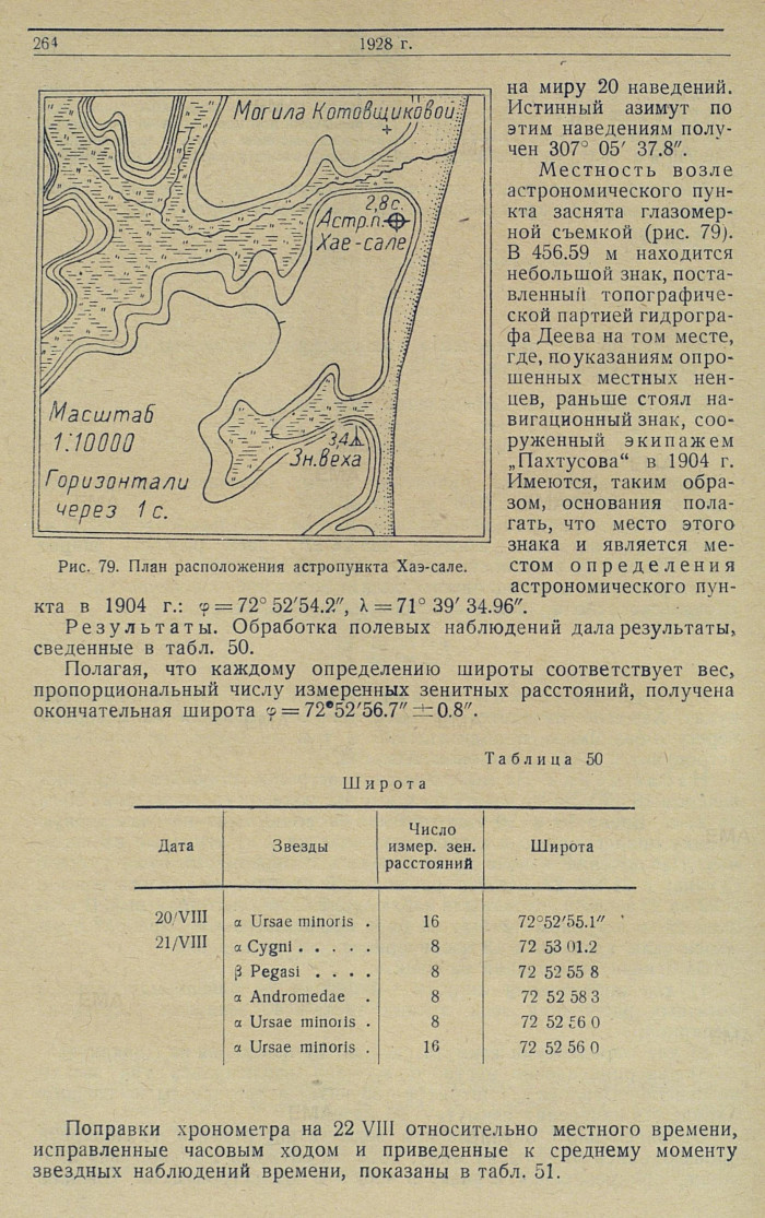 Широта определялась по наблюденным зенитным расстояниям звезд близ меридиана (главным образом Polaris и южных звезд). Этот способ при ненадежности северного неба также более применим, как не требующий предвычислений на месте и позволяющий свободно распоряжаться временем.