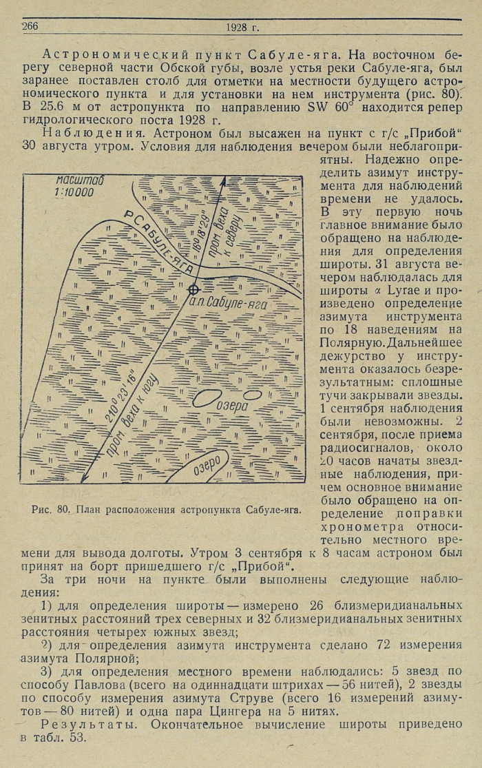 Астрономический пункт Сабуле-яга.На восточном берегу северной части Обской губы, возле устья реки Сабуле-яга, был заранее поставлен столб для отметки на местности будущего астрономического пункта и для установки на нем инструмента (рис. 80). В 25.6 м от астропункта по направлению SW 60° находится репер гидрологического поста 1928 г.