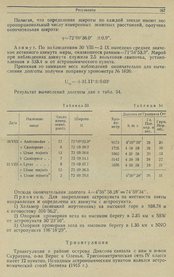 Азимут. По наблюдениям 30 VIII — 2 IX выведено среднее значение истинного азимута миры, оказавшееся равиым=71°54'53.3". Мирой при наблюдениях азимута служила 2.5 вольтовая лампочка, установленная в 533.4 м от астрономического пункта.