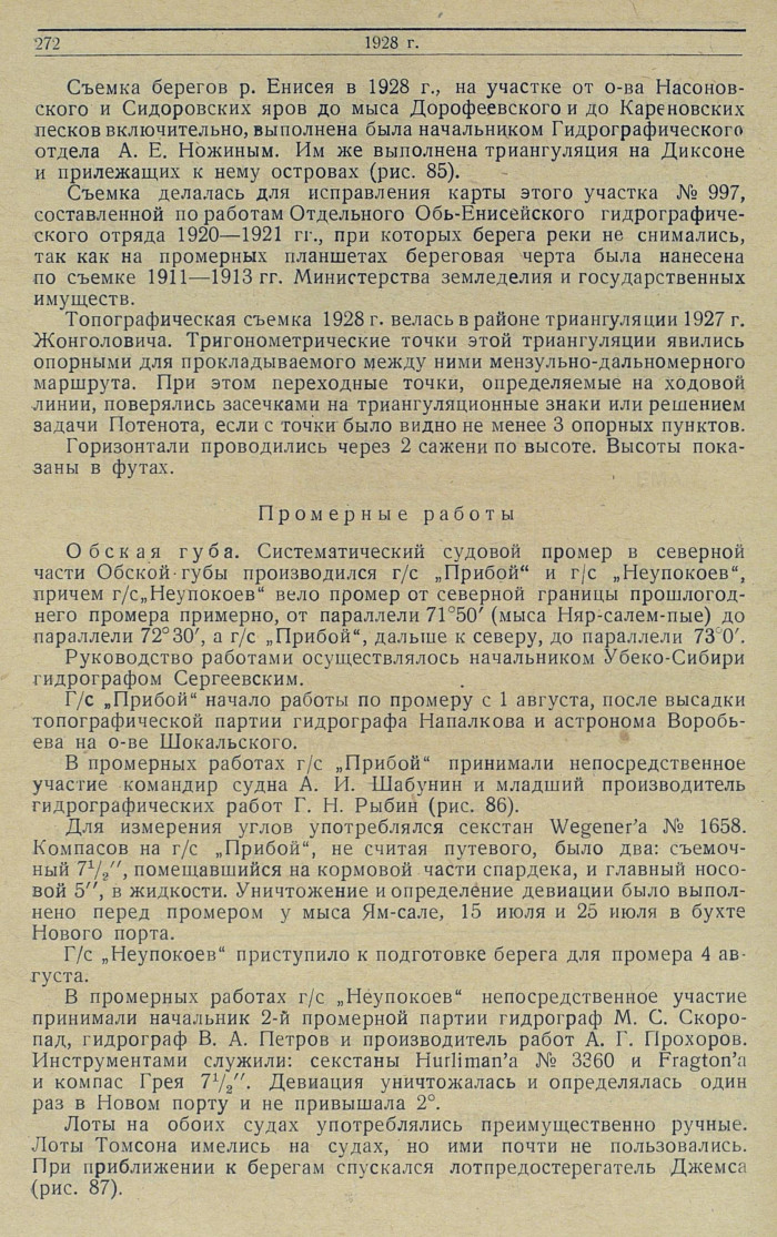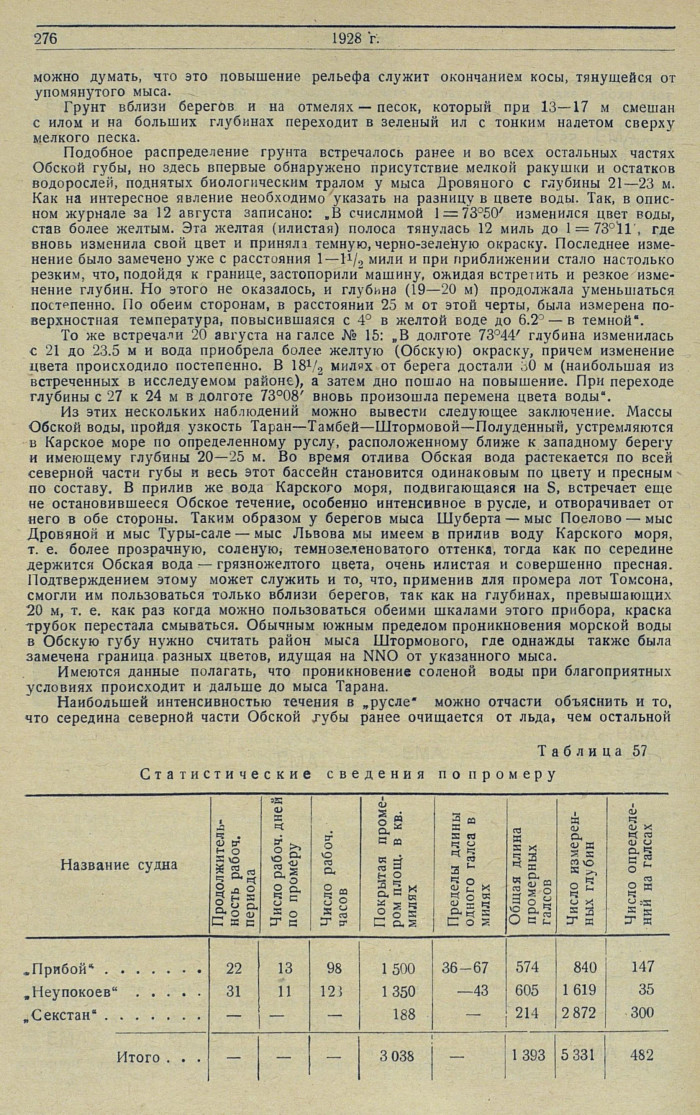 Промерные работыОбская губа. Систематический судовой промер в северной части Обской губы производился г/с „Прибой" и г/с „Неупокоев", причем г/с „Неупокоев" вело промер от северной границы прошлогоднего промера примерно, от параллели 71°50' (мыса Няр-салем-пые) до параллели 72°30', а г/с „Прибой", дальше к северу, до параллели 73 0'.