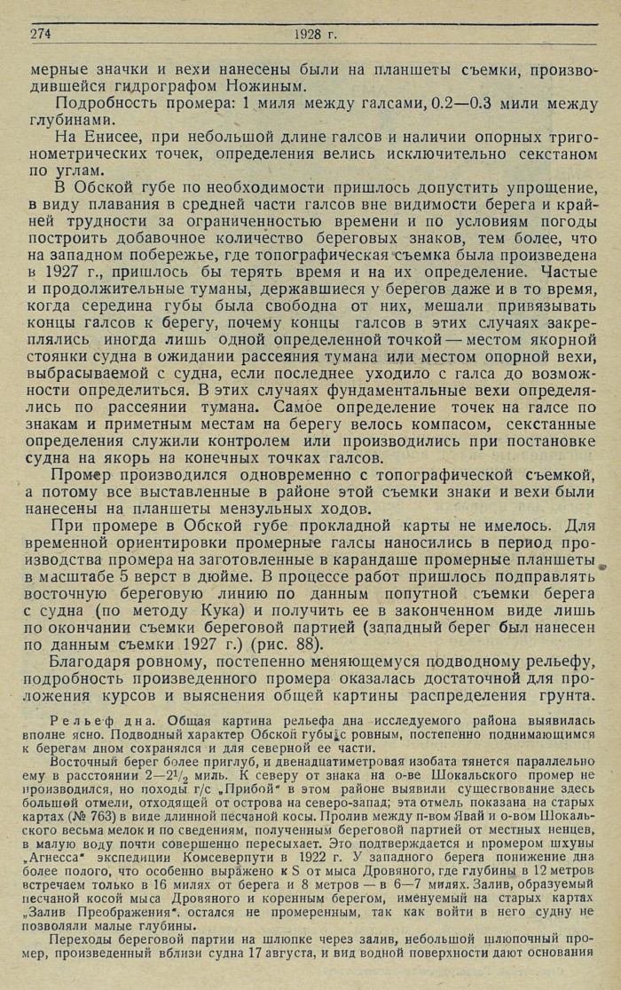 В Обской губе по необходимости пришлось допустить упрощение, в виду плавания в средней части галсов вне видимости берега и крайней трудности за ограниченностью времени и по условиям погоды построить добавочное количество береговых знаков, тем более, что на западном побережье, где топографическая съемка была произведена в 1927 г., пришлось бы терять время и на их определение. Частые и продолжительные туманы, державшиеся у берегов даже и в то время, когда середина губы была свободна от них, мешали привязывать концы галсов к берегу, почему концы галсов в этих случаях закреплялись иногда лишь одной определенной точкой — местом якорной стоянки судна в ожидании рассеяния тумана или местом опорной вехи, выбрасываемой с судна, если последнее уходило с галса до возможности определиться. В этих случаях фундаментальные вехи определялись по рассеянии тумана. Самое определение точек на галсе по знакам и приметным местам на берегу велось компасом, секстанные определения служили контролем или производились при постановке судна на якорь на конечных точках галсов.