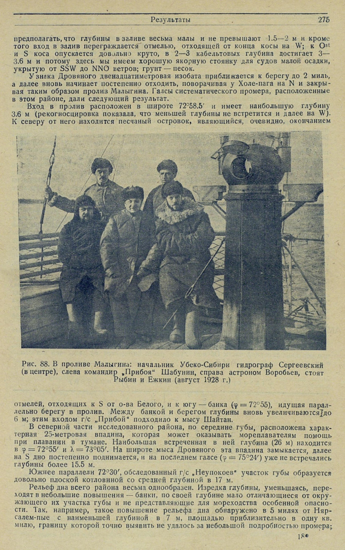 У знака Дровяного двенадцатиметровая изобата приближается к берегу до 2 миль, а далее вновь начинает постепенно отходить, поворачивая у Холе-пага на N и закрывая таким образом пролиз Малыгина. Галсы систематического промера, расположенные в этом районе, дали следующий результат.