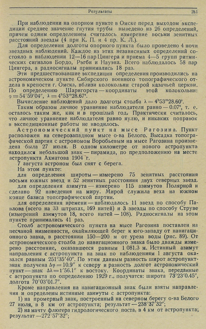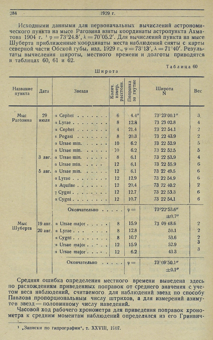 Исходными данными для первоначальных вычислений астрономического пункта на мысе Рагозина взяты координаты астропункта Ахматова 1904 г. 1 φ = 73°24.8', λ = 70°05.2'. Для вычислений пункта на мысе Шуберта приближенные координаты места наблюдений сняты с карты северной части Обской губы, изд. 1929 г., φ = 73°13', λ = 71°40'. Результаты вычисления широты, местного времени и долготы приводятся в таблицах 60, 61 и 62.