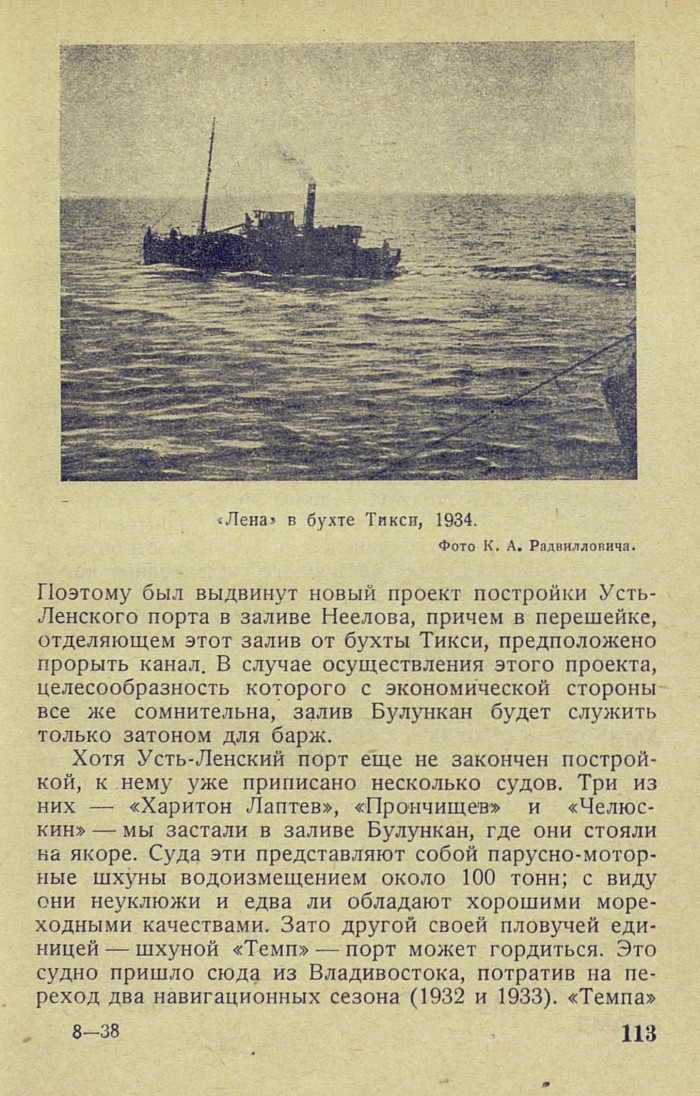 Хотя Усть-Ленский порт еще не закончен постройкой, к нему уже приписано несколько судов. Три из них — «Харитон Лаптев», «Прончищев» и «Челюскин» — мы застали в заливе Булункан, где они стояли на якоре. Суда эти представляют собой парусно-моторные шхуны водоизмещением около 100 тонн; с виду они неуклюжи и едва ли обладают хорошими мореходными качествами. Зато другой своей пловучей единицей — шхуной «Темп» — порт может гордиться. Это судно пришло сюда из Владивостока, потратив на переход два навигационных сезона (1932 и 1933). «Темпа»