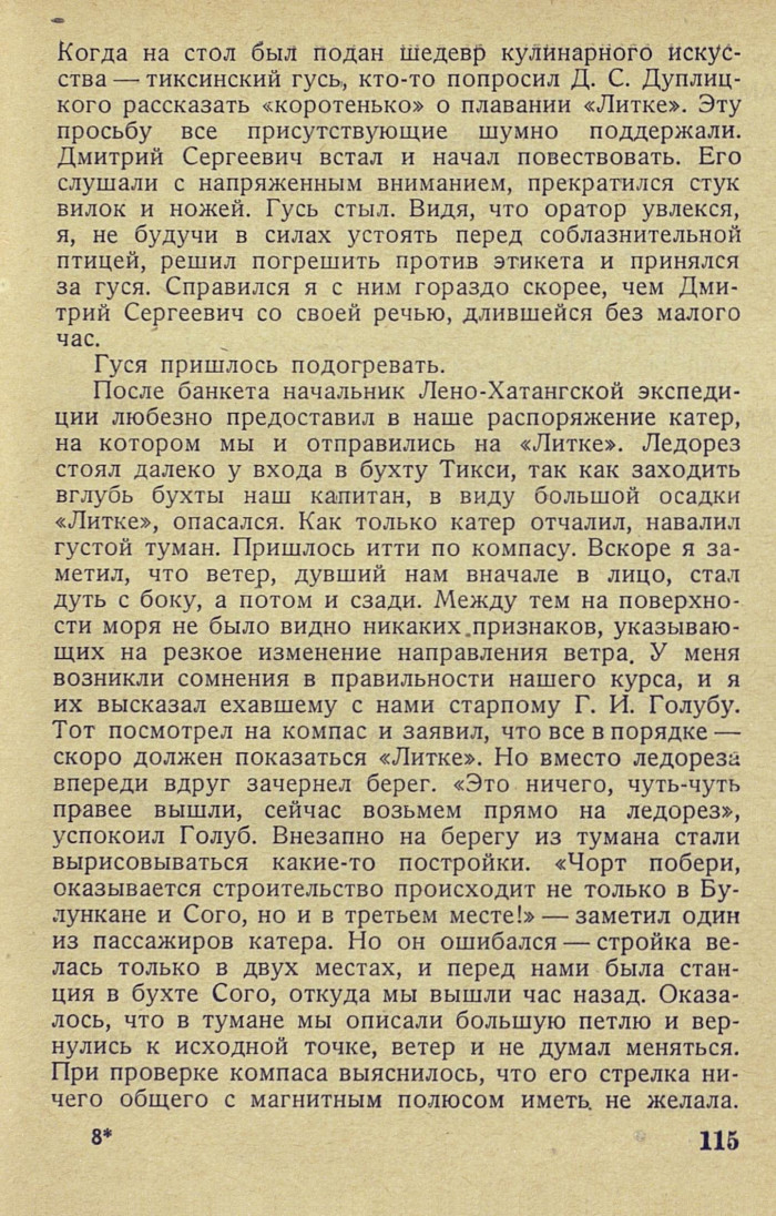 Когда на стол был подан шедевр кулинарного искусства — тиксинский гусь, кто-то попросил Д. С. Дуплицкого рассказать «коротенько» о плавании «Литке». Эту просьбу все присутствующие шумно поддержали. Дмитрий Сергеевич встал и начал повествовать. Его слушали с напряженным вниманием, прекратился стук вилок и ножей. Гусь стыл. Видя, что оратор увлекся, я, не будучи в силах устоять перед соблазнительной птицей, решил погрешить против этикета и принялся за гуся. Справился я с ним гораздо скорее, чем Дмитрий Сергеевич со своей речью, длившейся без малого час.