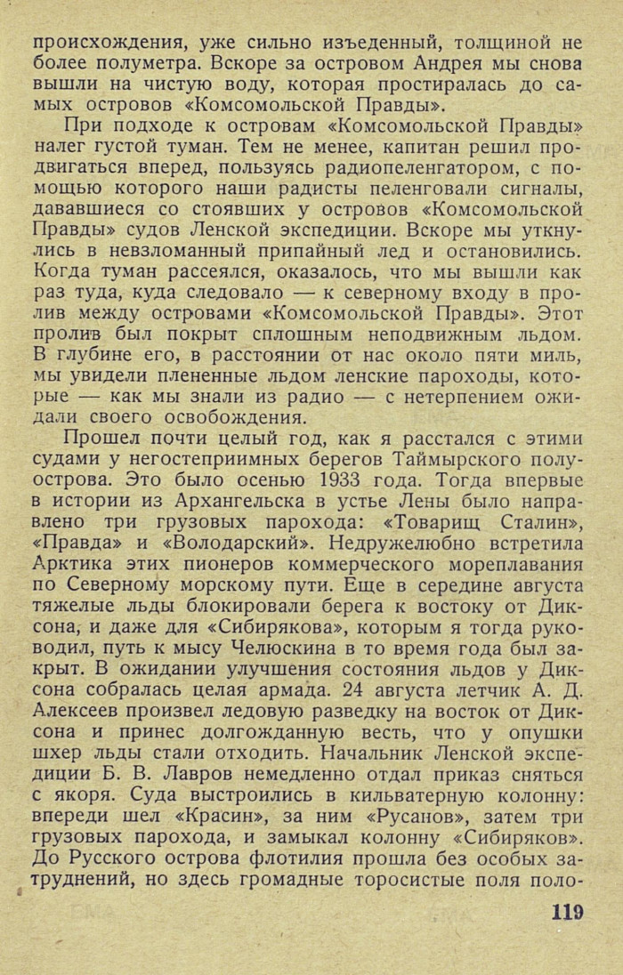 Прошел почти целый год, как я расстался с этими судами у негостеприимных берегов Таймырского полуострова. Это было осенью 1933 года. Тогда впервые в истории из Архангельска в устье Лены было направлено три грузовых парохода: «Товарищ Сталин», «Правда» и «Володарский». Недружелюбно встретила Арктика этих пионеров коммерческого мореплавания по Северному морскому пути. Еще в середине августа тяжелые льды блокировали берега к востоку от Диксона, и даже для «Сибирякова», которым я тогда руководил, путь к мысу Челюскина в то время года был закрыт. В ожидании улучшения состояния льдов у Диксона собралась целая армада. 24 августа летчик А. Д. Алексеев произвел ледовую разведку на восток от Диксона и принес долгожданную весть, что у опушки шхер льды стали отходить. Начальник Ленской экспедиции Б. В. Лавров немедленно отдал приказ сняться с якоря. Суда выстроились в кильватерную колонну: впереди шел «Красин», за ним «Русанов», затем три грузовых парохода, и замыкал колонну «Сибиряков». До Русского острова флотилия прошла без особых затруднений, но здесь громадные торосистые поля поло-